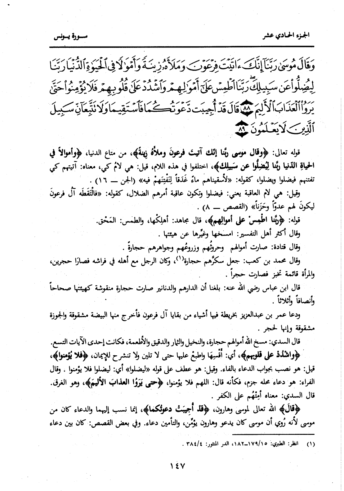 {وَقَالَ مُوسَى رَبَّنَا إِنَّكَ آتَيْتَ فِرْعَوْنَ وَمَلَأَهُ زِينَةً وَأَمْوَالًا فِي الْحَيَاةِ الدُّنْيَا رَبَّنَا لِيُضِلُّوا عَنْ سَبِيلِكَ رَبَّنَا اطْمِسْ عَلَى أَمْوَالِهِمْ وَاشْدُدْ عَلَى قُلُوبِهِمْ فَلَا يُؤْمِنُوا حَتَّى يَرَوُا الْعَذَابَ الْأَلِيمَ (88) } .