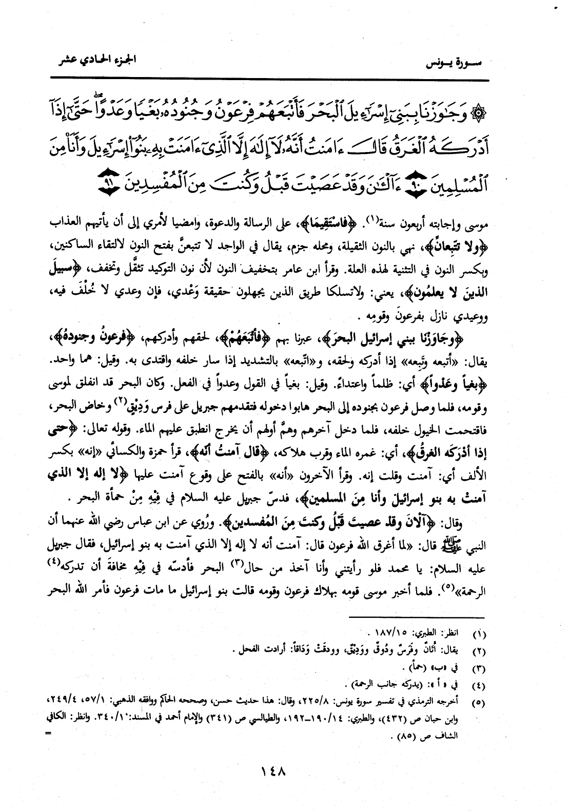 {وَجَاوَزْنَا بِبَنِي إِسْرَائِيلَ الْبَحْرَ فَأَتْبَعَهُمْ فِرْعَوْنُ وَجُنُودُهُ بَغْيًا وَعَدْوًا حَتَّى إِذَا أَدْرَكَهُ الْغَرَقُ قَالَ آمَنْتُ أَنَّهُ لَا إِلَهَ إِلَّا الَّذِي آمَنَتْ بِهِ بَنُو إِسْرَائِيلَ وَأَنَا مِنَ الْمُسْلِمِينَ (90) آلْآنَ وَقَدْ عَصَيْتَ قَبْلُ وَكُنْتَ مِنَ الْمُفْسِدِينَ (91) } .