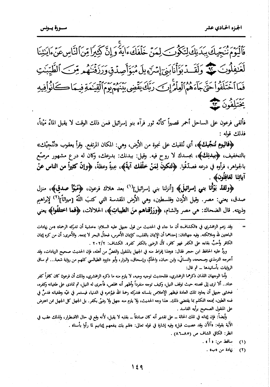 {فَالْيَوْمَ نُنَجِّيكَ بِبَدَنِكَ لِتَكُونَ لِمَنْ خَلْفَكَ آيَةً وَإِنَّ كَثِيرًا مِنَ النَّاسِ عَنْ آيَاتِنَا لَغَافِلُونَ (92) وَلَقَدْ بَوَّأْنَا بَنِي إِسْرَائِيلَ مُبَوَّأَ صِدْقٍ وَرَزَقْنَاهُمْ مِنَ الطَّيِّبَاتِ فَمَا اخْتَلَفُوا حَتَّى جَاءَهُمُ الْعِلْمُ إِنَّ رَبَّكَ يَقْضِي بَيْنَهُمْ يَوْمَ الْقِيَامَةِ فِيمَا كَانُوا فِيهِ يَخْتَلِفُونَ (93) } .