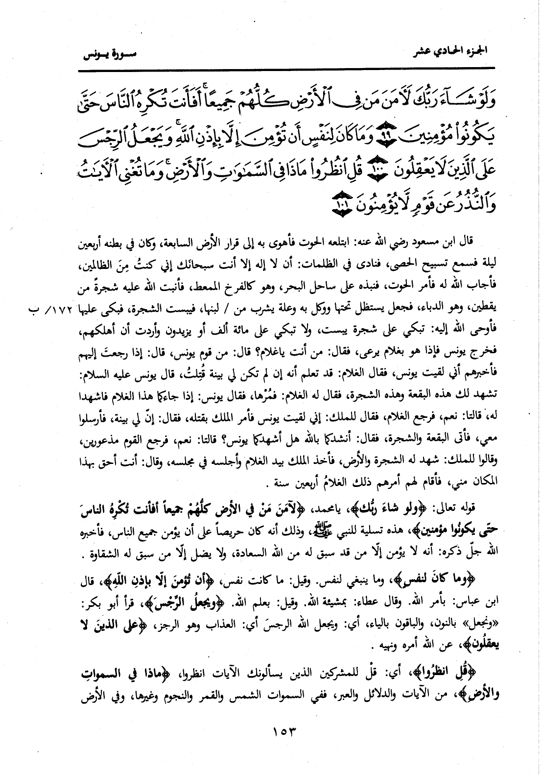 {وَلَوْ شَاءَ رَبُّكَ لَآمَنَ مَنْ فِي الْأَرْضِ كُلُّهُمْ جَمِيعًا أَفَأَنْتَ تُكْرِهُ النَّاسَ حَتَّى يَكُونُوا مُؤْمِنِينَ (99) وَمَا كَانَ لِنَفْسٍ أَنْ تُؤْمِنَ إِلَّا بِإِذْنِ اللَّهِ وَيَجْعَلُ الرِّجْسَ عَلَى الَّذِينَ لَا يَعْقِلُونَ (100) قُلِ انْظُرُوا مَاذَا فِي السَّمَوَاتِ وَالْأَرْضِ وَمَا تُغْنِي الْآيَاتُ وَالنُّذُرُ عَنْ قَوْمٍ لَا يُؤْمِنُونَ (101) } .