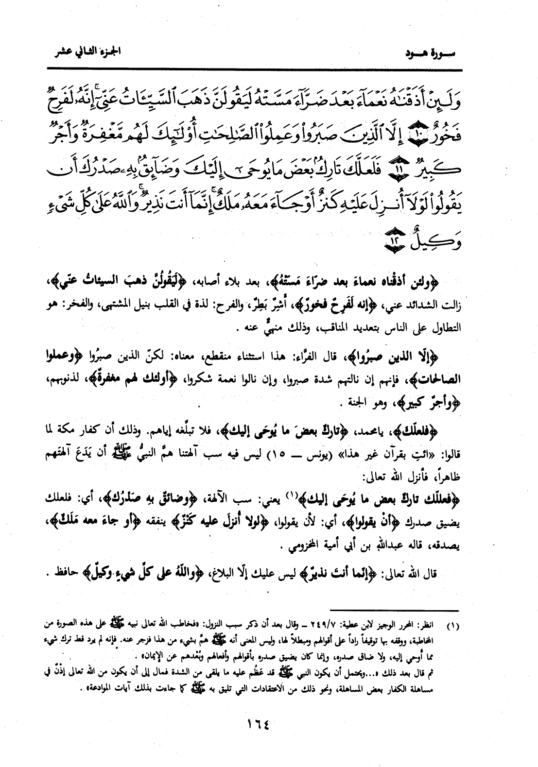 {وَلَئِنْ أَذَقْنَاهُ نَعْمَاءَ بَعْدَ ضَرَّاءَ مَسَّتْهُ لَيَقُولَنَّ ذَهَبَ السَّيِّئَاتُ عَنِّي إِنَّهُ لَفَرِحٌ فَخُورٌ (10) إِلَّا الَّذِينَ صَبَرُوا وَعَمِلُوا الصَّالِحَاتِ أُولَئِكَ لَهُمْ مَغْفِرَةٌ وَأَجْرٌ كَبِيرٌ (11) فَلَعَلَّكَ تَارِكٌ بَعْضَ مَا يُوحَى إِلَيْكَ وَضَائِقٌ بِهِ صَدْرُكَ أَنْ يَقُولُوا لَوْلَا أُنْزِلَ عَلَيْهِ كَنْزٌ أَوْ جَاءَ مَعَهُ مَلَكٌ إِنَّمَا أَنْتَ نَذِيرٌ وَاللَّهُ عَلَى كُلِّ شَيْءٍ وَكِيلٌ (12) } .