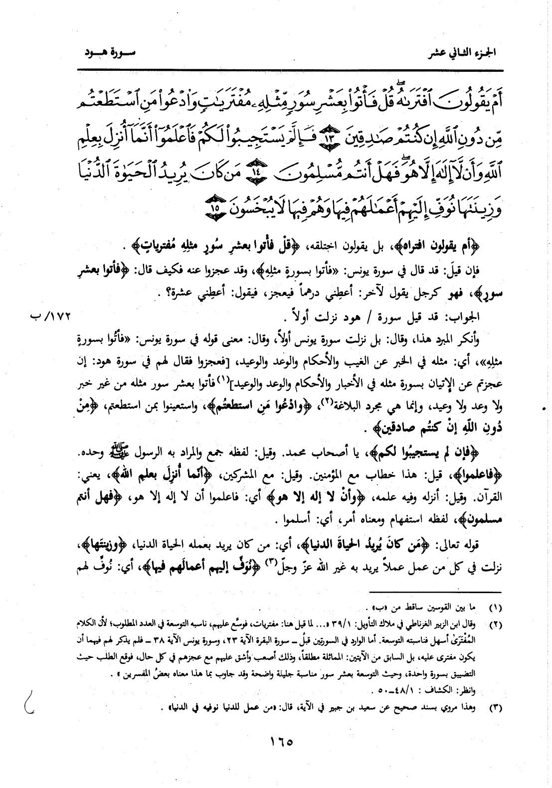(2) وقال ابن الزبير الغرناطي في ملاك التأويل: 1 / 39 " ... لما قيل هنا: مفتريات، فوسع عليهم، ناسبه التوسعة في العدد المطلوب؛ لأن الكلام المفترى أسهل فناسبته التوسعة. أما الوارد في السورتين قبلُ -سورة البقرة الآية 23، وسورة يونس الآية 38- فلم يذكر لهم فيهما أن يكون مفترى عليه، بل السابق من الآيتين: المماثلة مطلقا، وذلك أصعب وأشق عليهم مع عجزهم في كل حال، فوقع الطلب حيث التضييق بسورة واحدة، وحيث التوسعة بعشر سور مناسبة جليلة واضحة وقد جاوب بما هذا معناه وبعضُ المفسرين". وانظر: الكشاف: 1 / 48-50.