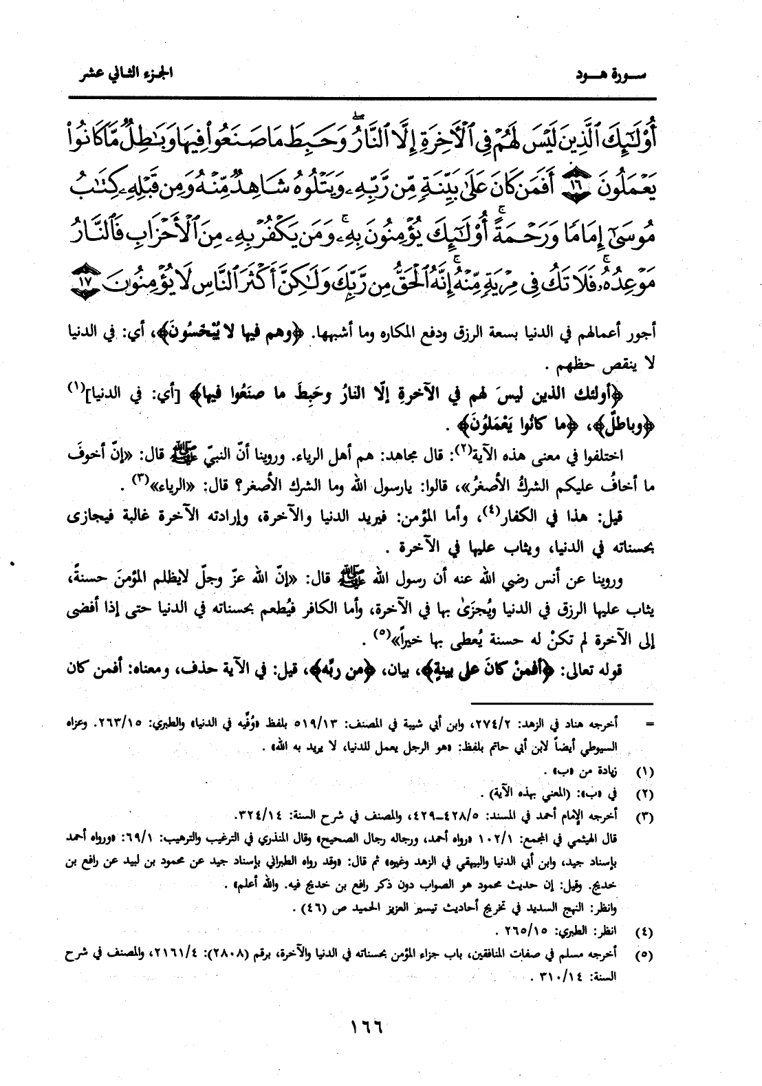 {أُولَئِكَ الَّذِينَ لَيْسَ لَهُمْ فِي الْآخِرَةِ إِلَّا النَّارُ وَحَبِطَ مَا صَنَعُوا فِيهَا وَبَاطِلٌ مَا كَانُوا يَعْمَلُونَ (16) أَفَمَنْ كَانَ عَلَى بَيِّنَةٍ مِنْ رَبِّهِ وَيَتْلُوهُ شَاهِدٌ مِنْهُ وَمِنْ قَبْلِهِ كِتَابُ مُوسَى إِمَامًا وَرَحْمَةً أُولَئِكَ يُؤْمِنُونَ بِهِ وَمَنْ يَكْفُرْ بِهِ مِنَ الْأَحْزَابِ فَالنَّارُ مَوْعِدُهُ فَلَا تَكُ فِي مِرْيَةٍ مِنْهُ إِنَّهُ الْحَقُّ مِنْ رَبِّكَ وَلَكِنَّ أَكْثَرَ النَّاسِ لَا يُؤْمِنُونَ (17) } .