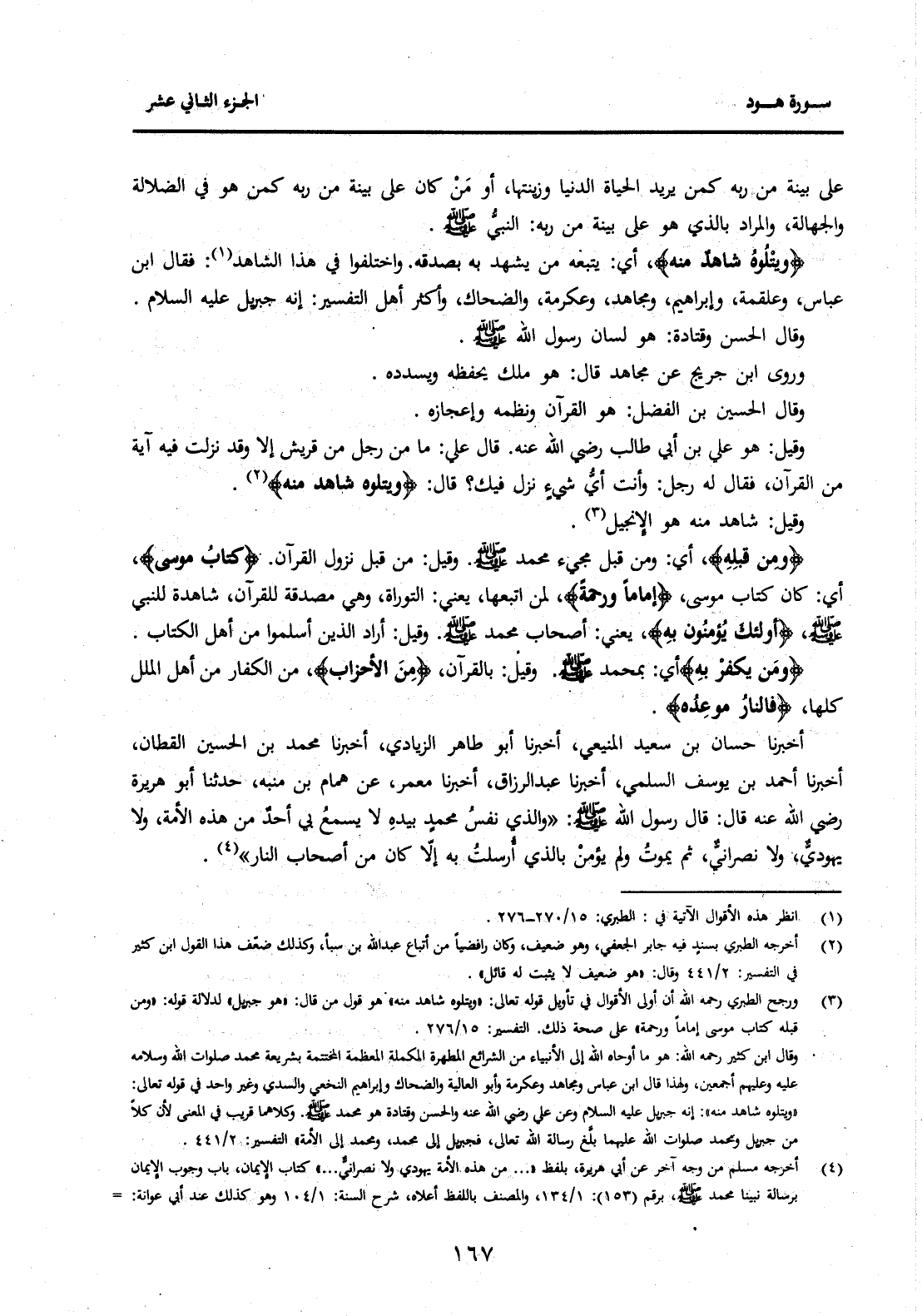 (3) ورجح الطبري رحمه الله أن أولى الأقوال في تأويل قوله تعالى: "ويتلوه شاهد منه" هو قول من قال: "هو جبريل" لدلالة قوله: "ومن قبله كتاب موسى إماما ورحمة" على صحة ذلك. التفسير: 15 / 276. وقال ابن كثير رحمه الله: " هو ما أوحاه الله إلى الأنبياء من الشرائع المطهرة المكملة المعظمة المختتمة بشريعة محمد صلوات الله وسلامه عليه وعليهم أجمعين، ولهذا قال ابن عباس ومجاهد وعكرمة وأبو العالية والضحاك وإبراهيم النخعي والسدي وغير واحد في قوله تعالى: "ويتلوه شاهد منه": إنه جبريل عليه السلام وعن علي رضي الله عنه والحسن وقتادة هو محمد صَلَّى اللَّهُ عَلَيْهِ وَسَلَّمَ. وكلاهما قريب في المعنى لأن كلا من جبريل ومحمد صلوات الله عليهما بلَّغ رسالة الله تعالى، فجبريل إلى محمد، ومحمد إلى الأمة" التفسير: 2 / 441.