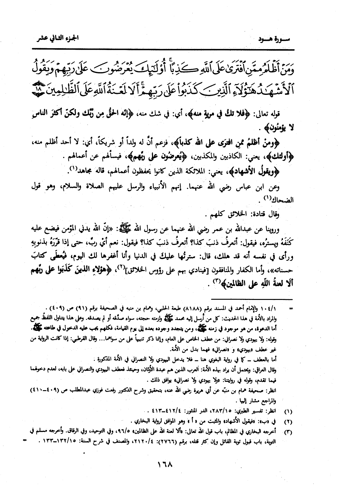 {وَمَنْ أَظْلَمُ مِمَّنِ افْتَرَى عَلَى اللَّهِ كَذِبًا أُولَئِكَ يُعْرَضُونَ عَلَى رَبِّهِمْ وَيَقُولُ الْأَشْهَادُ هَؤُلَاءِ الَّذِينَ كَذَبُوا عَلَى رَبِّهِمْ أَلَا لَعْنَةُ اللَّهِ عَلَى الظَّالِمِينَ (18) } .