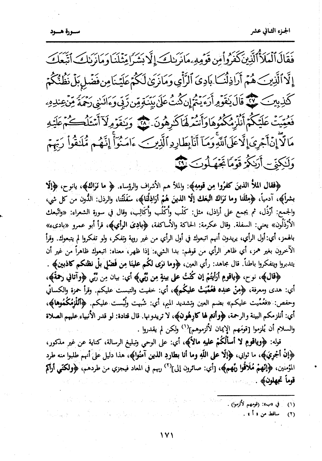 {فَقَالَ الْمَلَأُ الَّذِينَ كَفَرُوا مِنْ قَوْمِهِ} وَالْمَلَأُ هُمُ الْأَشْرَافُ وَالرُّؤَسَاءُ. {وَمَا نَرَاكَ} يَا نُوحُ، {إِلَّا بَشَرًا} آدَمِيًّا، {مِثْلَنَا وَمَا نَرَاكَ اتَّبَعَكَ إِلَّا الَّذِينَ هُمْ أَرَاذِلُنَا} سَفَلَتُنَا، وَالرَّذْلُ: الدُّونُ مِنْ كُلِّ شَيْءٍ وَالْجَمْعُ: أَرْذُلٌ، ثُمَّ يُجْمَعُ عَلَى أَرَاذِلَ، مِثْلَ: كَلْبٍ وَأَكْلُبٍ وَأَكَالِبَ، وَقَالَ فِي سُورَةِ الشُّعَرَاءِ: " وَاتَّبَعَكَ الْأَرْذَلُونَ " يَعْنِي: السَّفَلَةَ. وَقَالَ عِكْرِمَةُ: الْحَاكَةُ وَالْأَسَاكِفَةُ، {بَادِيَ الرَّأْيِ} قَرَأَ أَبُو عَمْرٍو "بَادِئَ" بِالْهَمْزِ، أَيْ: أَوَّلَ الرَّأْيِ، يُرِيدُونَ أَنَّهُمُ اتَّبَعُوكَ فِي أَوَّلِ الرَّأْيِ مِنْ غَيْرِ رَوِيَّةٍ وَتَفَكُّرٍ، وَلَوْ تَفَكَّرُوا لَمْ يَتَّبِعُوكَ. وَقَرَأَ الْآخَرُونَ بِغَيْرِ هَمْزٍ، أَيْ ظَاهِرَ الرَّأْيِ مِنْ قَوْلِهِمْ: بَدَا الشَّيْءُ: إِذَا ظَهَرَ، مَعْنَاهُ: اتَّبَعُوكَ ظَاهِرًا مِنْ غَيْرِ أَنْ يَتَدَبَّرُوا وَيَتَفَكَّرُوا بَاطِنًا. قَالَ مُجَاهِدٌ: رَأْيَ الْعَيْنِ، {وَمَا نَرَى لَكُمْ عَلَيْنَا مِنْ فَضْلٍ بَلْ نَظُنُّكُمْ كَاذِبِينَ} .