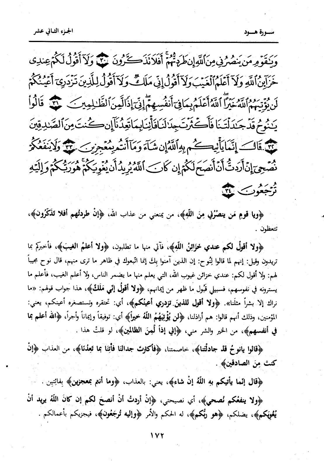 {وَيَا قَوْمِ مَنْ يَنْصُرُنِي مِنَ اللَّهِ إِنْ طَرَدْتُهُمْ أَفَلَا تَذَكَّرُونَ (30) وَلَا أَقُولُ لَكُمْ عِنْدِي خَزَائِنُ اللَّهِ وَلَا أَعْلَمُ الْغَيْبَ وَلَا أَقُولُ إِنِّي مَلَكٌ وَلَا أَقُولُ لِلَّذِينَ تَزْدَرِي أَعْيُنُكُمْ لَنْ يُؤْتِيَهُمُ اللَّهُ خَيْرًا اللَّهُ أَعْلَمُ بِمَا فِي أَنْفُسِهِمْ إِنِّي إِذًا لَمِنَ الظَّالِمِينَ (31) قَالُوا يَا نُوحُ قَدْ جَادَلْتَنَا فَأَكْثَرْتَ جِدَالَنَا فَأْتِنَا بِمَا تَعِدُنَا إِنْ كُنْتَ مِنَ الصَّادِقِينَ (32) قَالَ إِنَّمَا يَأْتِيكُمْ بِهِ اللَّهُ إِنْ شَاءَ وَمَا أَنْتُمْ بِمُعْجِزِينَ (33) وَلَا يَنْفَعُكُمْ نُصْحِي إِنْ أَرَدْتُ أَنْ أَنْصَحَ لَكُمْ إِنْ كَانَ اللَّهُ يُرِيدُ أَنْ يُغْوِيَكُمْ هُوَ رَبُّكُمْ وَإِلَيْهِ تُرْجَعُونَ (34) } .