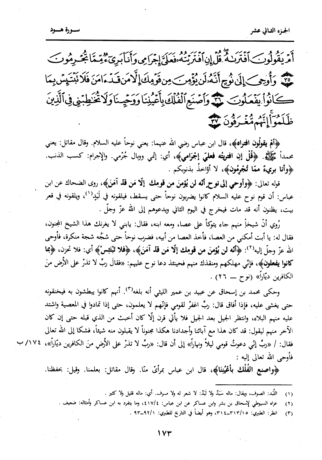{أَمْ يَقُولُونَ افْتَرَاهُ قُلْ إِنِ افْتَرَيْتُهُ فَعَلَيَّ إِجْرَامِي وَأَنَا بَرِيءٌ مِمَّا تُجْرِمُونَ (35) وَأُوحِيَ إِلَى نُوحٍ أَنَّهُ لَنْ يُؤْمِنَ مِنْ قَوْمِكَ إِلَّا مَنْ قَدْ آمَنَ فَلَا تَبْتَئِسْ بِمَا كَانُوا يَفْعَلُونَ (36) وَاصْنَعِ الْفُلْكَ بِأَعْيُنِنَا وَوَحْيِنَا وَلَا تُخَاطِبْنِي فِي الَّذِينَ ظَلَمُوا إِنَّهُمْ مُغْرَقُونَ (37) } .