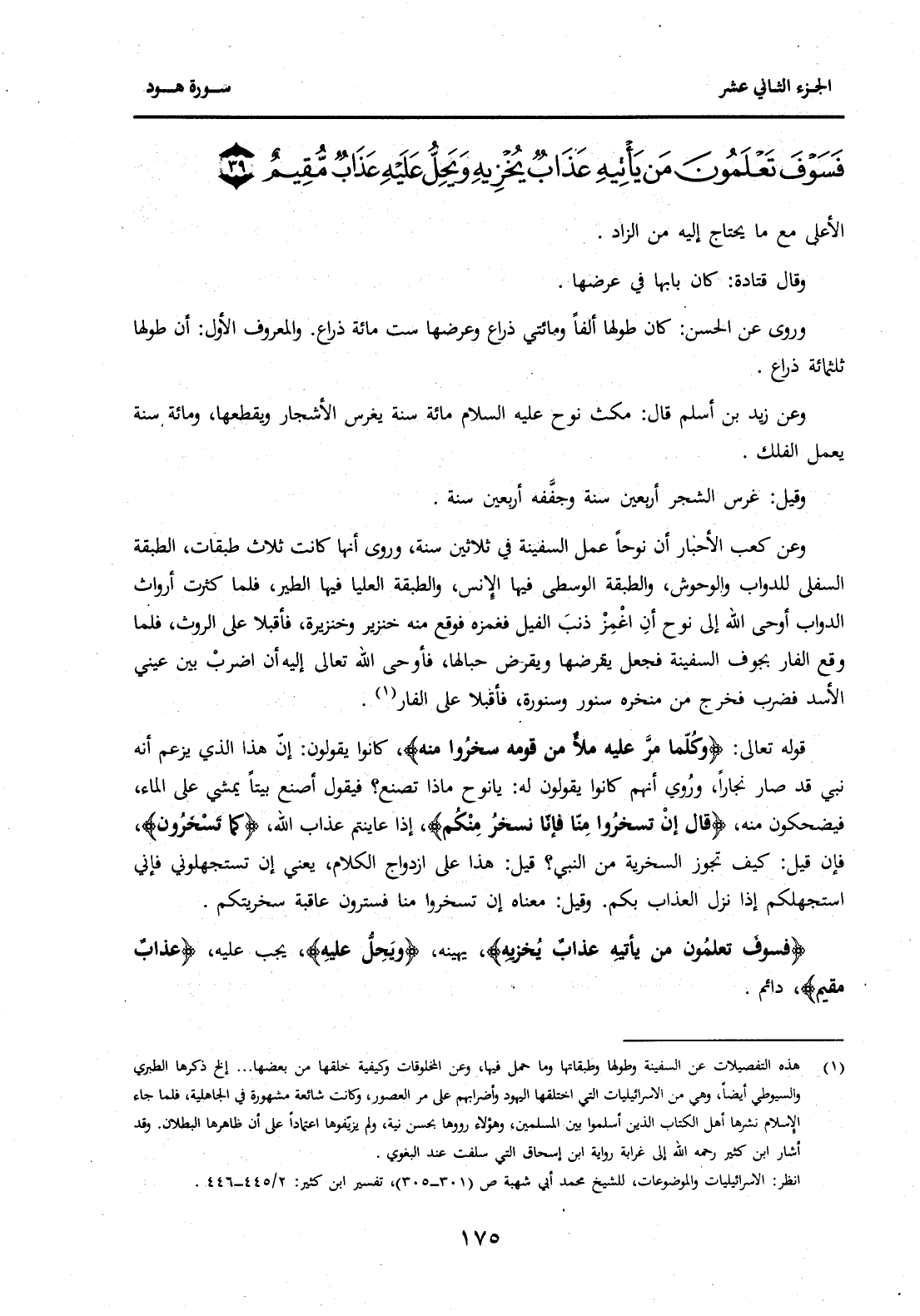 قَوْلُهُ تَعَالَى: {وَكُلَّمَا مَرَّ عَلَيْهِ مَلَأٌ مِنْ قَوْمِهِ سَخِرُوا مِنْهُ} كَانُوا يَقُولُونَ: إِنَّ هَذَا الَّذِي يَزْعُمُ أَنَّهُ نَبِيٌّ قَدْ صَارَ نَجَّارًا، وَرُوِيَ أَنَّهُمْ كَانُوا يَقُولُونَ لَهُ: يَا نُوحُ مَاذَا تَصْنَعُ؟ فَيَقُولُ أَصْنَعُ بَيْتًا يَمْشِي عَلَى الْمَاءِ، فَيَضْحَكُونَ مِنْهُ، {قَالَ إِنْ تَسْخَرُوا مِنَّا فَإِنَّا نَسْخَرُ مِنْكُمْ} إِذَا عَايَنْتُمْ عَذَابَ اللَّهِ، {كَمَا تَسْخَرُونَ} فَإِنْ قِيلَ: كَيْفَ تَجُوزُ السُّخْرِيَةُ مِنَ النَّبِيِّ؟ قِيلَ: هَذَا عَلَى ازْدِوَاجِ الْكَلَامِ، يَعْنِي إِنْ تَسْتَجْهِلُونِي فَإِنِّي أَسْتَجْهِلُكُمْ إِذَا نَزَلَ الْعَذَابُ بِكُمْ. وَقِيلَ: مَعْنَاهُ إِنْ تَسْخَرُوا مِنَّا فَسَتَرَوْنَ عَاقِبَةَ سُخْرِيَتِكُمْ.