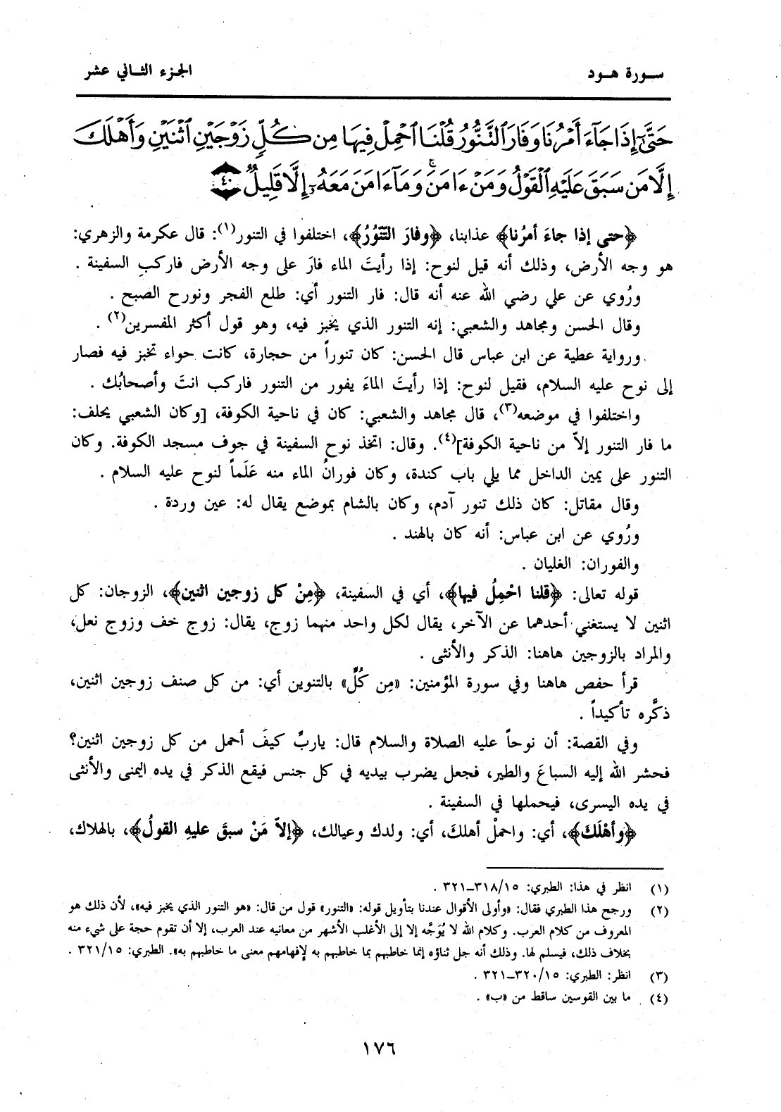 (2) ورجح هذا الطبري فقال: "وأولى الأقوال عندنا بتأويل قوله: "التنور" قول من قال: "هو التنور الذي يخبز فيه"، لأن ذلك هو المعروف من كلام العرب. وكلام الله لا يُوَجَّه إلا إلى الأغلب الأشهر من معانيه عند العرب، إلا أن تقوم حجة على شيء منه بخلاف ذلك، فيسلم لها. وذك أنه جل ثناؤه إنما خاطبهم بما خاطبهم به لإفهامهم معنى ما خاطبهم به". الطبري: 15 / 321.