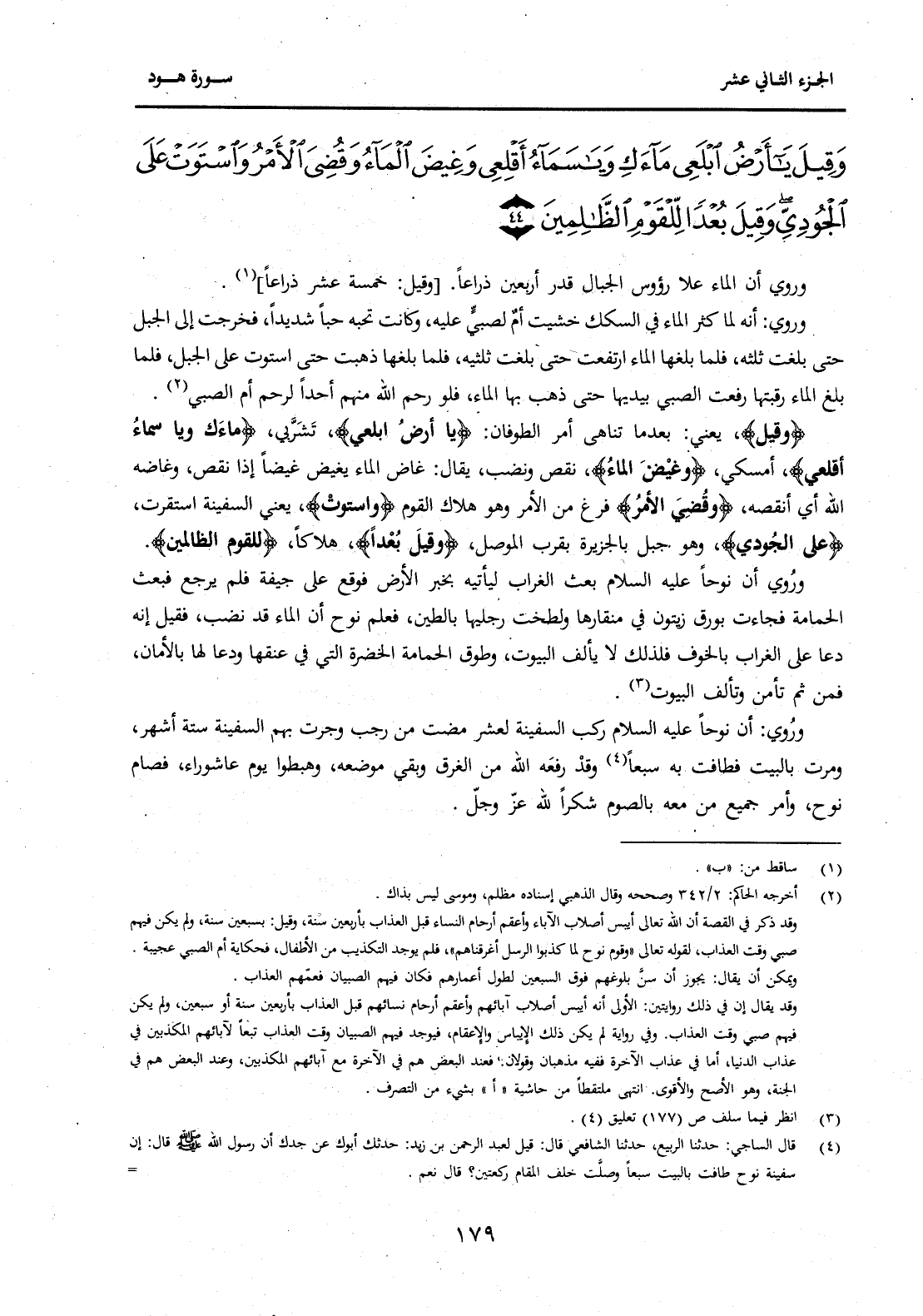 (2) أخرجه الحاكم: 2 / 342 وصححه وقال الذهبي إسناده مظلم، وموسى ليس بذاك. وقد ذكر في القصة أن الله تعالى أيبس أصلاب الآباء وأعقم أرحام النساء قبل العذاب بأربعين سنة، وقيل: بسبعين سنة، ولم يكن فيهم صبي وقت العذاب، لقوله تعالى "وقوم نوح لما كذبوا الرسل أغرقناهم"، فلم يوجد التكذيب من الأطفال، فحكاية أم الصبي عجيبة. ويمكن أن يقال: يجوز أن سن بلوغهم فوق السبعين لطول أعمارهم فكان فيهم الصبيان فعمهم العذاب. وقد يقال إن في ذلك روايتين: الأولى أنه أيبس أصلاب آبائهم وأعقم أرحام نسائهم قبل العذاب بأربعين سنة أو سبعين، ولم يكن فيهم صبي وقت العذاب. وفي رواية لم يكن ذلك الإيباس والإعقام، فيوجد فيهم الصبيان وقت العذاب تبعا لآبائهم المكذبين في عذاب الدنيا، أما في عذاب الآخرة ففيه مذهبان وقولان. فعند البعض هم في الآخرة مع آبائهم المكذبين، وعند البعض هم في الجنة، وهو الأصح والأقوى. انتهى ملتقطا من حاشية "أ" بشيء من التصرف.