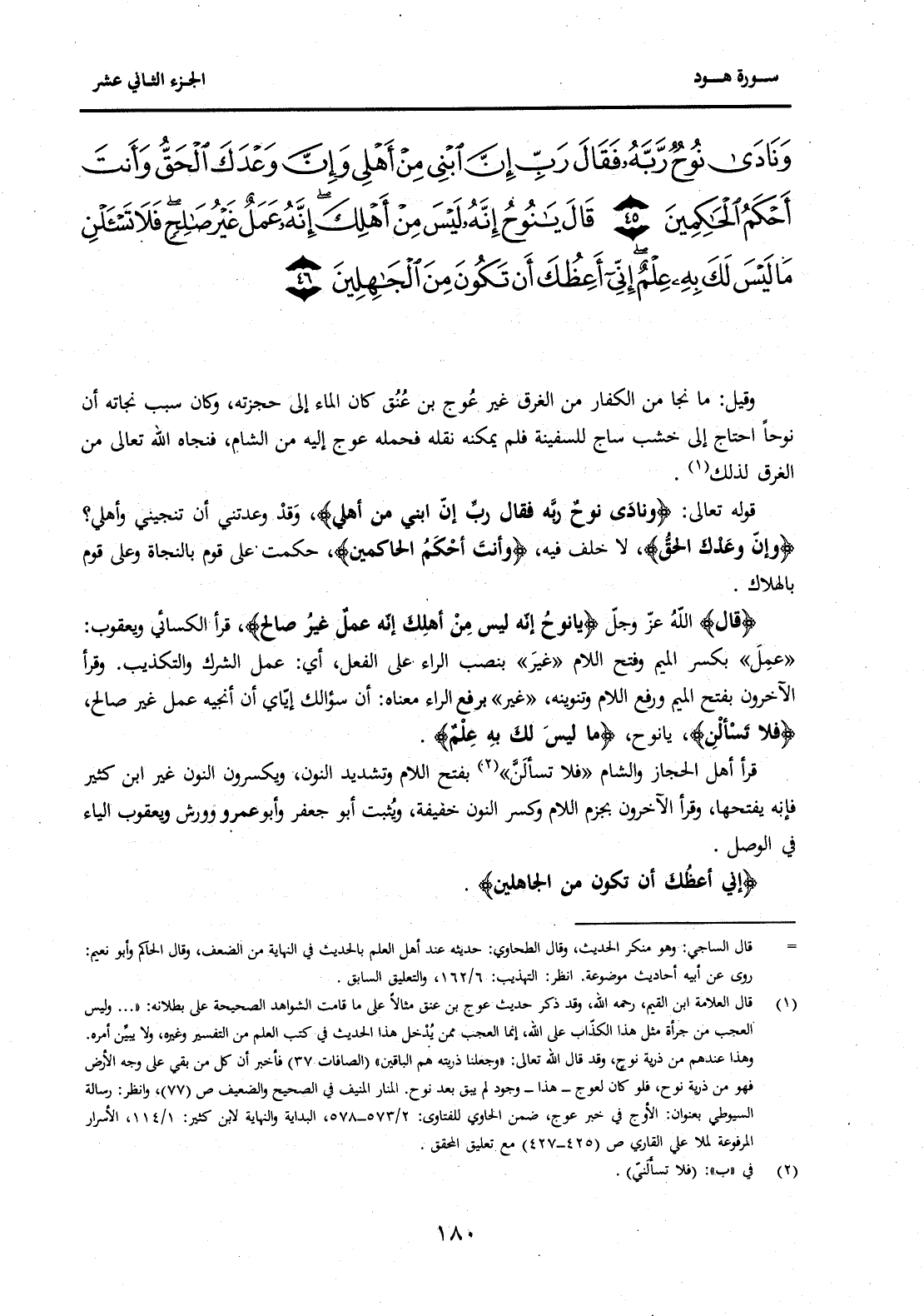 {قَالَ} اللَّهُ عَزَّ وَجَلَّ: {يَا نُوحُ إِنَّهُ لَيْسَ مِنْ أَهْلِكَ إِنَّهُ عَمَلٌ غَيْرُ صَالِحٍ} قَرَأَ الْكِسَائِيُّ وَيَعْقُوبُ: "عَمِلَ" بِكَسْرِ الْمِيمِ وَفَتْحِ اللَّامِ "غَيْرَ" بِنَصْبِ الرَّاءِ عَلَى الْفِعْلِ، أَيْ: عَمِلَ الشِّرْكَ وَالتَّكْذِيبَ. وَقَرَأَ الْآخَرُونَ بِفَتْحِ الْمِيمِ وَرَفْعِ اللَّامِ وَتَنْوِينِهِ، "غَيْرُ" بِرَفْعِ الرَّاءِ مَعْنَاهُ: أَنَّ سُؤَالَكَ إِيَّايَ أَنْ أُنْجِيَهُ عَمَلٌ غَيْرُ صَالِحٍ، {فَلَا تَسْأَلْنِ} يَا نُوحُ، {مَا لَيْسَ لَكَ بِهِ عِلْمٌ} .