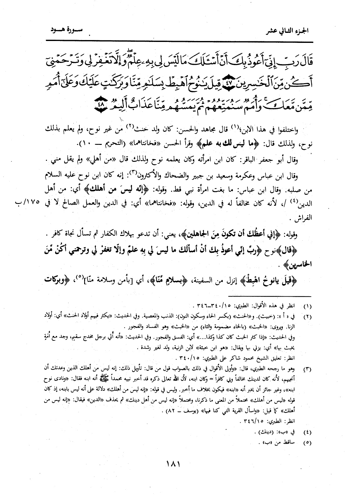 (3) وهو ما رجحه الطبري، قال: "وأولى الأقوال في ذلك بالصواب قول من قال: تأويل ذلك: إنه ليس من أهلك الذين وعدتك أن أنجيهم، لأنه كان لدينك مخالفا وبي كافرا = وكان ابنه، لأن الله تعالى ذكره قد أخبر نبيه محمدًا صَلَّى اللَّهُ عَلَيْهِ وَسَلَّمَ أنه ابنه فقال: "ونادى نوح ابنه"، وغير جائز أن يخبر أنه "ابنه" فيكون بخلاف ما أخبر. وليس في قوله: "إنه ليس من أهلك" دلالة على أنه ليس بابنه، إذ كان قوله "ليس من أهلك" محتملا من المعنى ما ذكرنا، ومحتملا "إنه ليس من أهل دينك" ثم يحذف "الدين" فيقال: "إنه ليس من أهلك" كما قيل: "واسأل القرية التي كنا فيها" (يوسف - 82) . انظر: الطبري: 15 / 346.