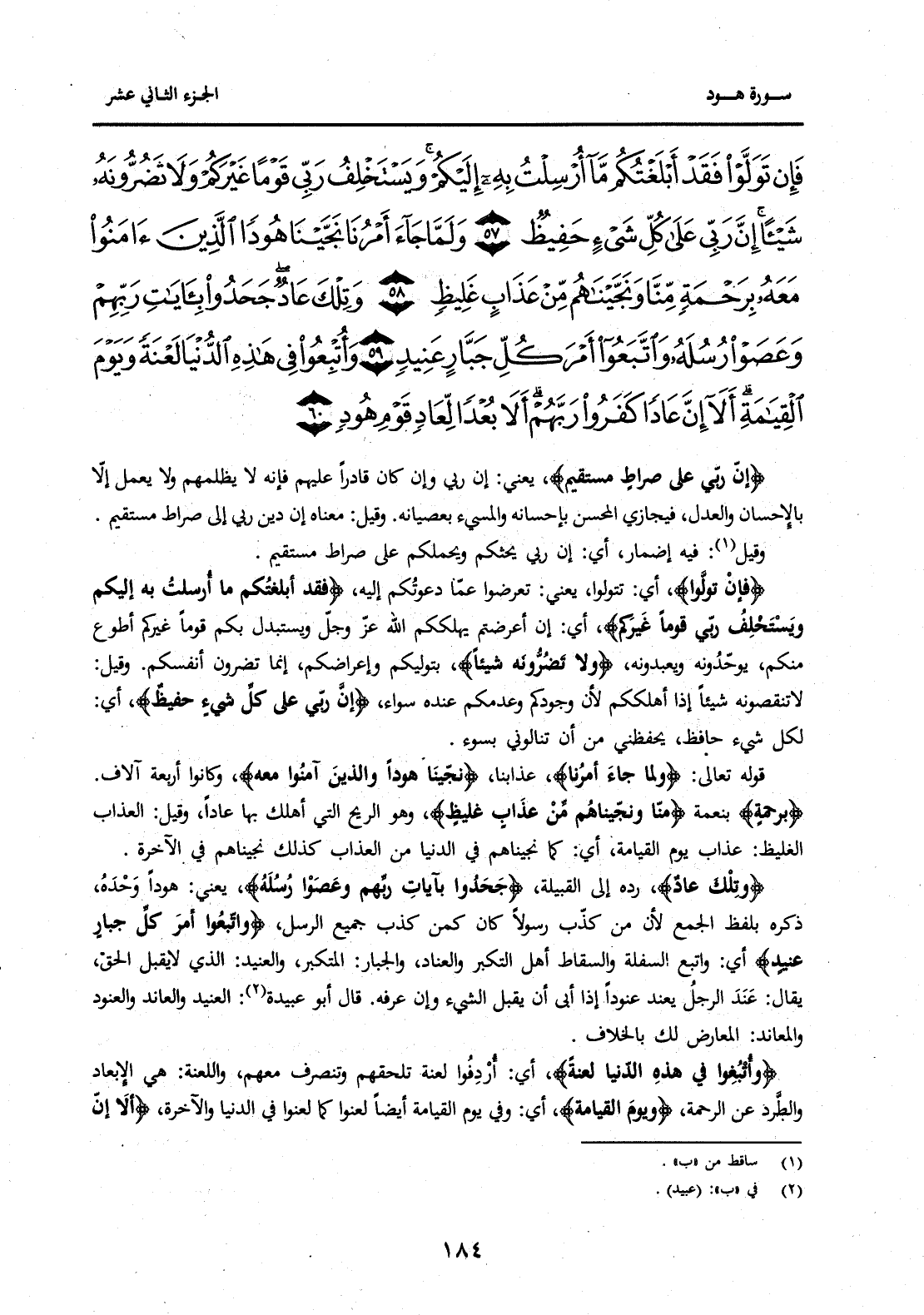 {فَإِنْ تَوَلَّوْا فَقَدْ أَبْلَغْتُكُمْ مَا أُرْسِلْتُ بِهِ إِلَيْكُمْ وَيَسْتَخْلِفُ رَبِّي قَوْمًا غَيْرَكُمْ وَلَا تَضُرُّونَهُ شَيْئًا إِنَّ رَبِّي عَلَى كُلِّ شَيْءٍ حَفِيظٌ (57) وَلَمَّا جَاءَ أَمْرُنَا نَجَّيْنَا هُودًا وَالَّذِينَ آمَنُوا مَعَهُ بِرَحْمَةٍ مِنَّا وَنَجَّيْنَاهُمْ مِنْ عَذَابٍ غَلِيظٍ (58) وَتِلْكَ عَادٌ جَحَدُوا بِآيَاتِ رَبِّهِمْ وَعَصَوْا رُسُلَهُ وَاتَّبَعُوا أَمْرَ كُلِّ جَبَّارٍ عَنِيدٍ (59) وَأُتْبِعُوا فِي هَذِهِ الدُّنْيَا لَعْنَةً وَيَوْمَ الْقِيَامَةِ أَلَا إِنَّ عَادًا كَفَرُوا رَبَّهُمْ أَلَا بُعْدًا لِعَادٍ قَوْمِ هُودٍ (60) } .