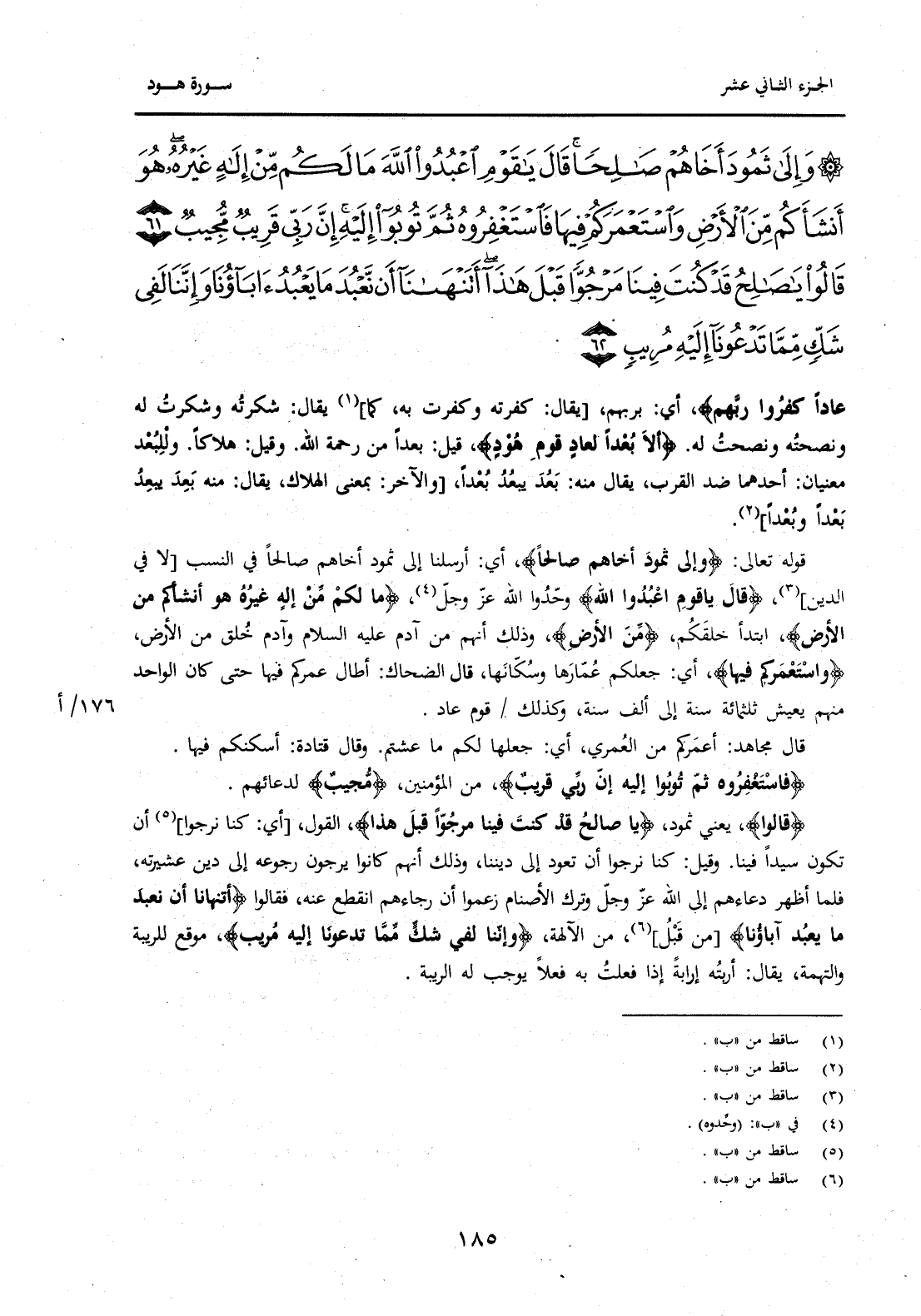 {وَإِلَى ثَمُودَ أَخَاهُمْ صَالِحًا قَالَ يَا قَوْمِ اعْبُدُوا اللَّهَ مَا لَكُمْ مِنْ إِلَهٍ غَيْرُهُ هُوَ أَنْشَأَكُمْ مِنَ الْأَرْضِ وَاسْتَعْمَرَكُمْ فِيهَا فَاسْتَغْفِرُوهُ ثُمَّ تُوبُوا إِلَيْهِ إِنَّ رَبِّي قَرِيبٌ مُجِيبٌ (61) قَالُوا يَا صَالِحُ قَدْ كُنْتَ فِينَا مَرْجُوًّا قَبْلَ هَذَا أَتَنْهَانَا أَنْ نَعْبُدَ مَا يَعْبُدُ آبَاؤُنَا وَإِنَّنَا لَفِي شَكٍّ مِمَّا تَدْعُونَا إِلَيْهِ مُرِيبٍ (62) } .