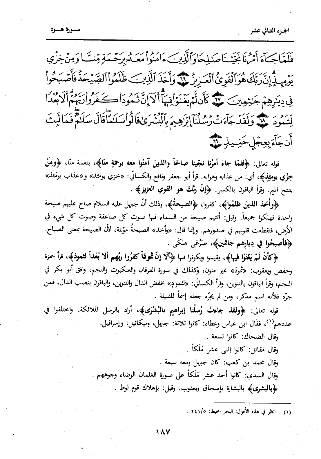 قَوْلُهُ تَعَالَى: {وَلَقَدْ جَاءَتْ رُسُلُنَا إِبْرَاهِيمَ بِالْبُشْرَى} أَرَادَ بِالرُّسُلِ الْمَلَائِكَةَ. وَاخْتَلَفُوا فِي عَدَدِهِمْ (1) ، فَقَالَ ابْنُ عَبَّاسٍ وَعَطَاءٌ: كَانُوا ثَلَاثَةً: جِبْرِيلَ، وَمِيكَائِيلَ، وَإِسْرَافِيلَ.