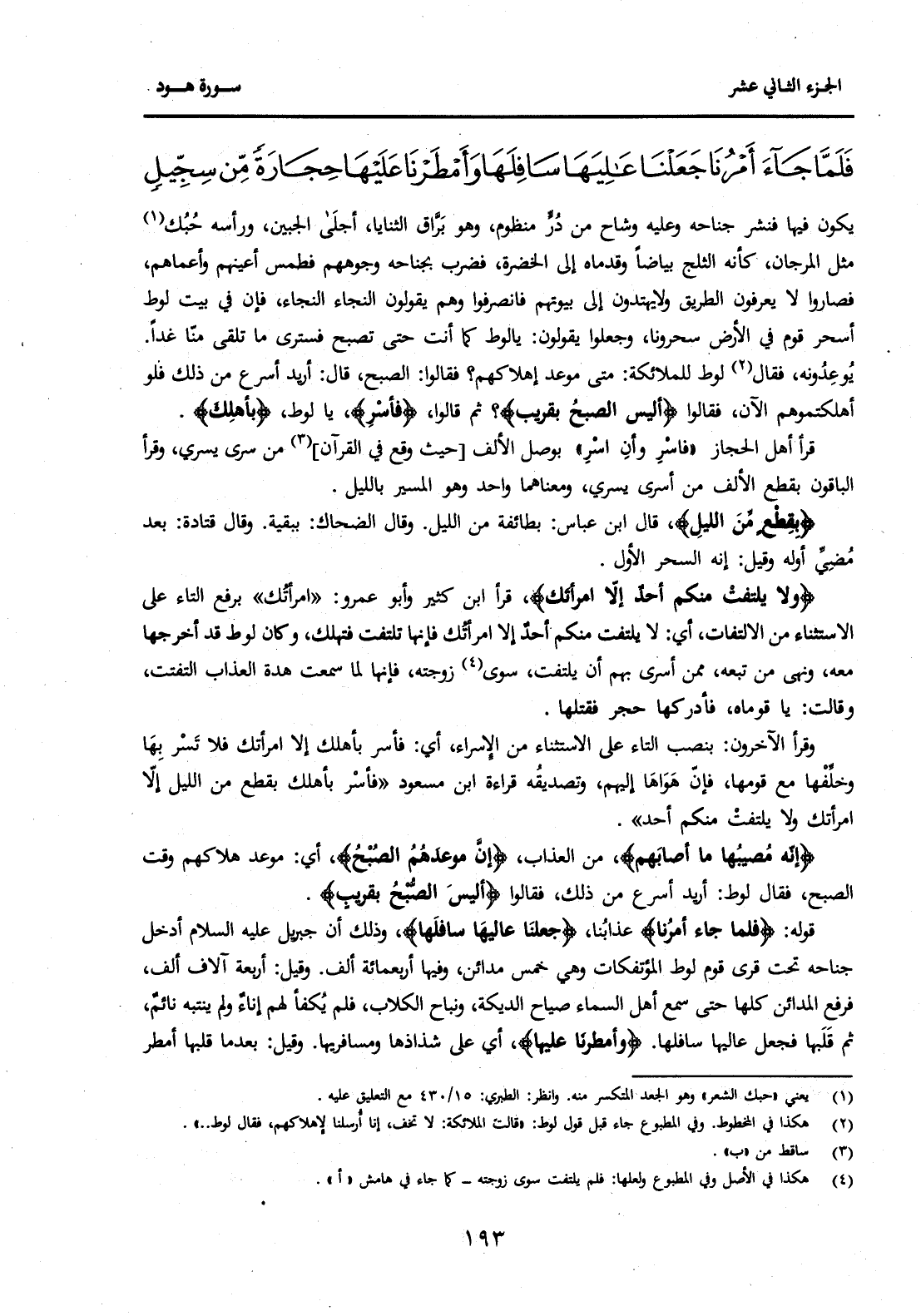 (2) هكذا في المخطوط. وفي المطبوع جاء قبل قول لوط: "قالت الملائكة: لا تخف، إنا أرسلنا لإهلاكهم، فقال لوط ... ".