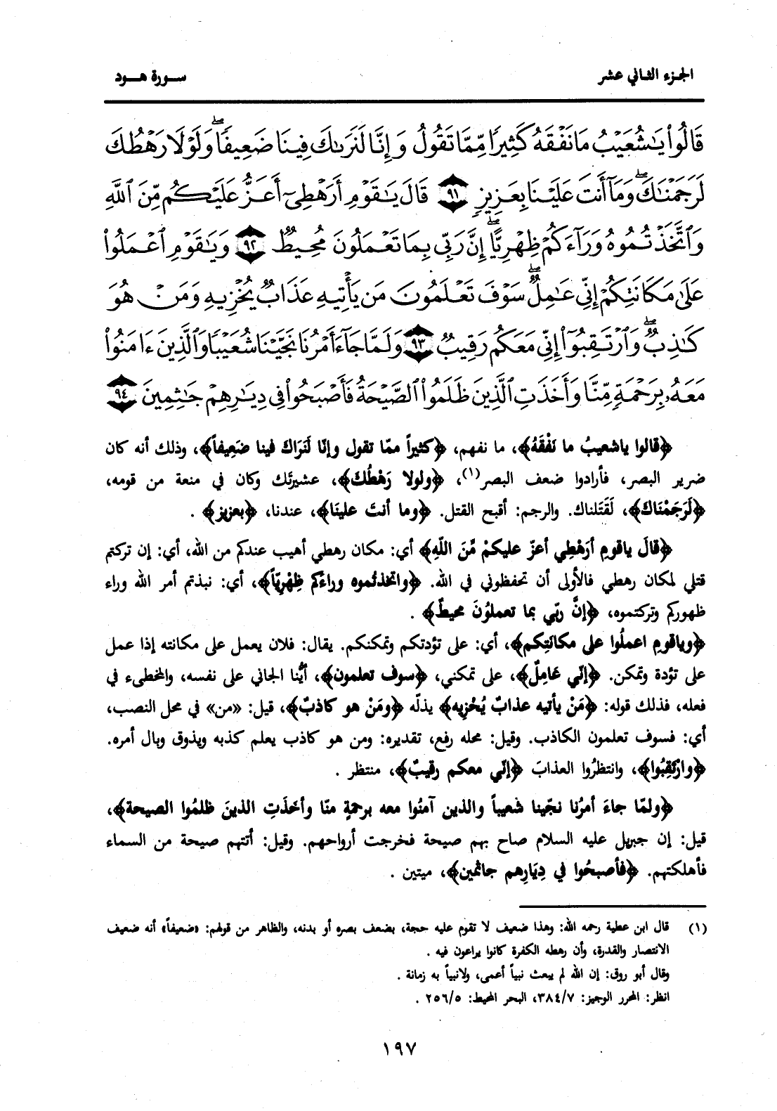 {قَالُوا يَا شُعَيْبُ مَا نَفْقَهُ كَثِيرًا مِمَّا تَقُولُ وَإِنَّا لَنَرَاكَ فِينَا ضَعِيفًا وَلَوْلَا رَهْطُكَ لَرَجَمْنَاكَ وَمَا أَنْتَ عَلَيْنَا بِعَزِيزٍ (91) قَالَ يَا قَوْمِ أَرَهْطِي أَعَزُّ عَلَيْكُمْ مِنَ اللَّهِ وَاتَّخَذْتُمُوهُ وَرَاءَكُمْ ظِهْرِيًّا إِنَّ رَبِّي بِمَا تَعْمَلُونَ مُحِيطٌ (92) وَيَا قَوْمِ اعْمَلُوا عَلَى مَكَانَتِكُمْ إِنِّي عَامِلٌ سَوْفَ تَعْلَمُونَ مَنْ يَأْتِيهِ عَذَابٌ يُخْزِيهِ وَمَنْ هُوَ كَاذِبٌ وَارْتَقِبُوا إِنِّي مَعَكُمْ رَقِيبٌ (93) وَلَمَّا جَاءَ أَمْرُنَا نَجَّيْنَا شُعَيْبًا وَالَّذِينَ آمَنُوا مَعَهُ بِرَحْمَةٍ مِنَّا وَأَخَذَتِ الَّذِينَ ظَلَمُوا الصَّيْحَةُ فَأَصْبَحُوا فِي دِيَارِهِمْ جَاثِمِينَ (94) } .