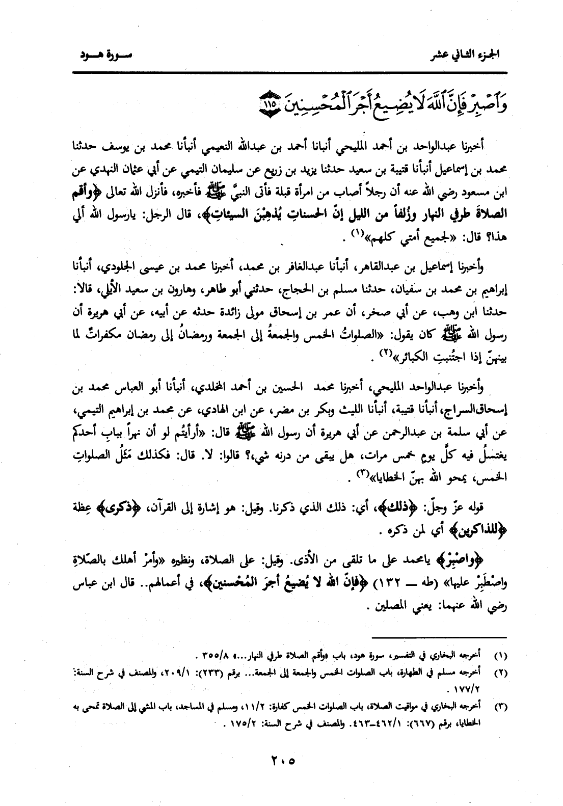 أَخْبَرَنَا عَبْدُ الْوَاحِدِ بْنُ أَحْمَدَ الْمَلِيحِيُّ أَنْبَأَنَا أَحْمَدُ بْنُ عَبْدِ اللَّهِ النُّعَيْمِيُّ أَنْبَأَنَا مُحَمَّدُ بْنُ يُوسُفَ حَدَّثَنَا مُحَمَّدُ بْنُ إِسْمَاعِيلَ أَنْبَأَنَا قُتَيْبَةُ بْنُ سَعِيدٍ، حَدَّثَنَا يَزِيدُ بْنُ زُرَيْعٍ عَنْ سُلَيْمَانَ التَّيْمِيِّ عَنْ أَبِي عُثْمَانَ النَّهْدِيِّ عَنِ ابْنِ مَسْعُودٍ رَضِيَ اللَّهُ عَنْهُ أَنَّ رَجُلًا أَصَابَ مِنَ امْرَأَةٍ قُبْلَةً فَأَتَى النَّبِيَّ صَلَّى اللَّهُ عَلَيْهِ وَسَلَّمَ فَأَخْبَرَهُ، فَأَنْزَلَ اللَّهُ تَعَالَى {وَأَقِمِ الصَّلَاةَ طَرَفَيِ النَّهَارِ وَزُلَفًا مِنَ اللَّيْلِ إِنَّ الْحَسَنَاتِ يُذْهِبْنَ السَّيِّئَاتِ} قَالَ الرَّجُلُ: يَا رَسُولَ اللَّهِ أَلِي هَذَا؟ قَالَ: "لِجَمِيعِ أُمَّتِي كُلِّهِمْ" (1) .