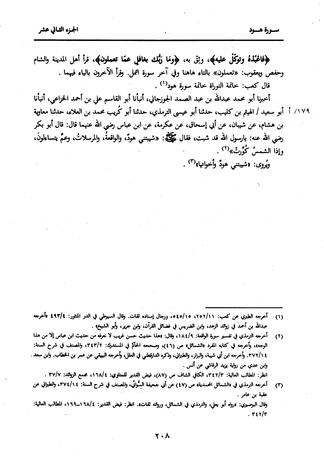أَخْبَرَنَا أَبُو مُحَمَّدٍ عَبْدُ اللَّهِ بْنُ عَبْدِ الصَّمَدِ الْجَوْزَجَانِيُّ، أَنْبَأَنَا أَبُو الْقَاسِمِ عَلِيُّ بْنُ أَحْمَدَ الْخُزَاعِيُّ، أَنْبَأَنَا أبو سعيد 179/أالْهَيْثَمُ بْنُ كُلَيْبٍ، حَدَّثَنَا أَبُو عِيسَى التِّرْمِذِيُّ، حَدَّثَنَا أَبُو كُرَيْبٍ مُحَمَّدُ بْنُ الْعَلَاءِ، حَدَّثَنَا مُعَاوِيَةُ بْنُ هِشَامٍ، عَنْ شَيْبَانَ، عَنْ أَبِي إِسْحَاقَ، عَنْ عِكْرِمَةَ، عَنِ ابْنِ عَبَّاسٍ رَضِيَ اللَّهُ عَنْهُمَا قَالَ: قَالَ أَبُو بَكْرٍ رَضِيَ اللَّهُ عَنْهُ: يَا رَسُولَ اللَّهِ قَدْ شِبْتَ، فَقَالَ صَلَّى اللَّهُ عَلَيْهِ وَسَلَّمَ: "شَيَّبَتْنِي هُودٌ، وَالْوَاقِعَةُ، وَالْمُرْسَلَاتُ، وَعَمَّ يَتَسَاءَلُونَ، وَإِذَا الشَّمْسُ كُوِّرَتْ" (2) .