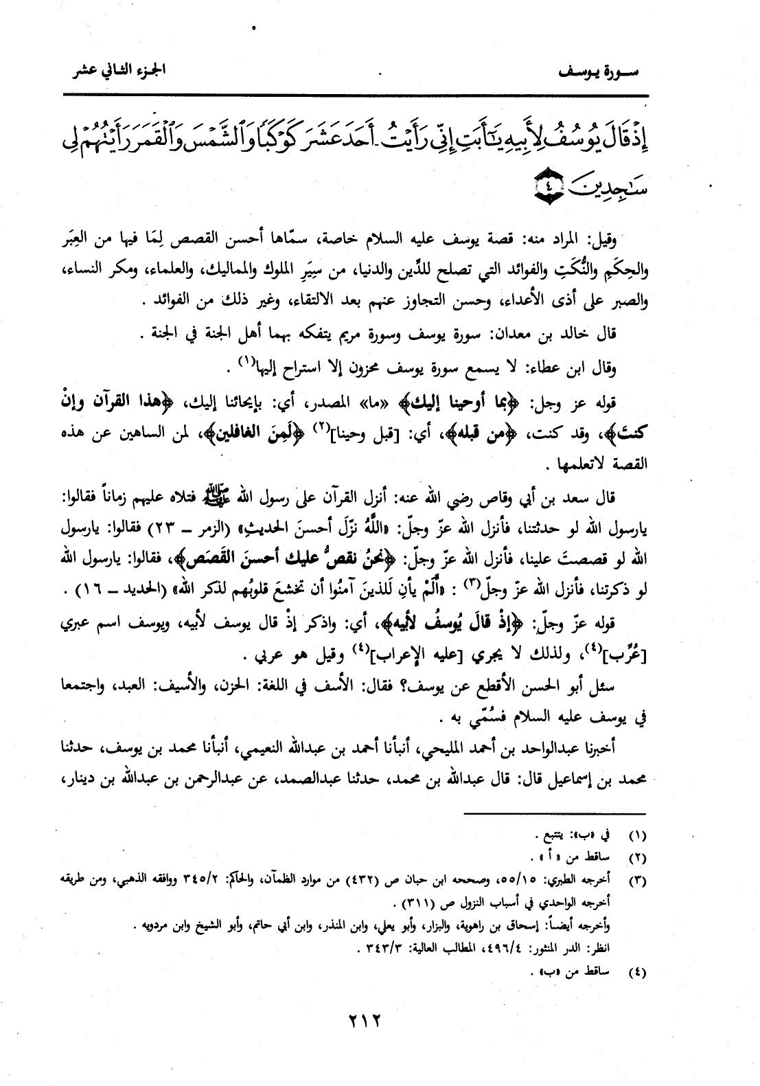قَوْلُهُ عَزَّ وَجَلَّ: {إِذْ قَالَ يُوسُفُ لِأَبِيهِ} أَيْ: وَاذْكُرْ إِذْ قَالَ يُوسُفُ لِأَبِيهِ، وَيُوسُفُ اسْمٌ عِبْرِيٌّ [عُرِّبَ] (4) ، وَلِذَلِكَ لَا يَجْرِي [عَلَيْهِ الْإِعْرَابُ] وَقِيلَ هُوَ عَرَبِيٌّ (5) .
