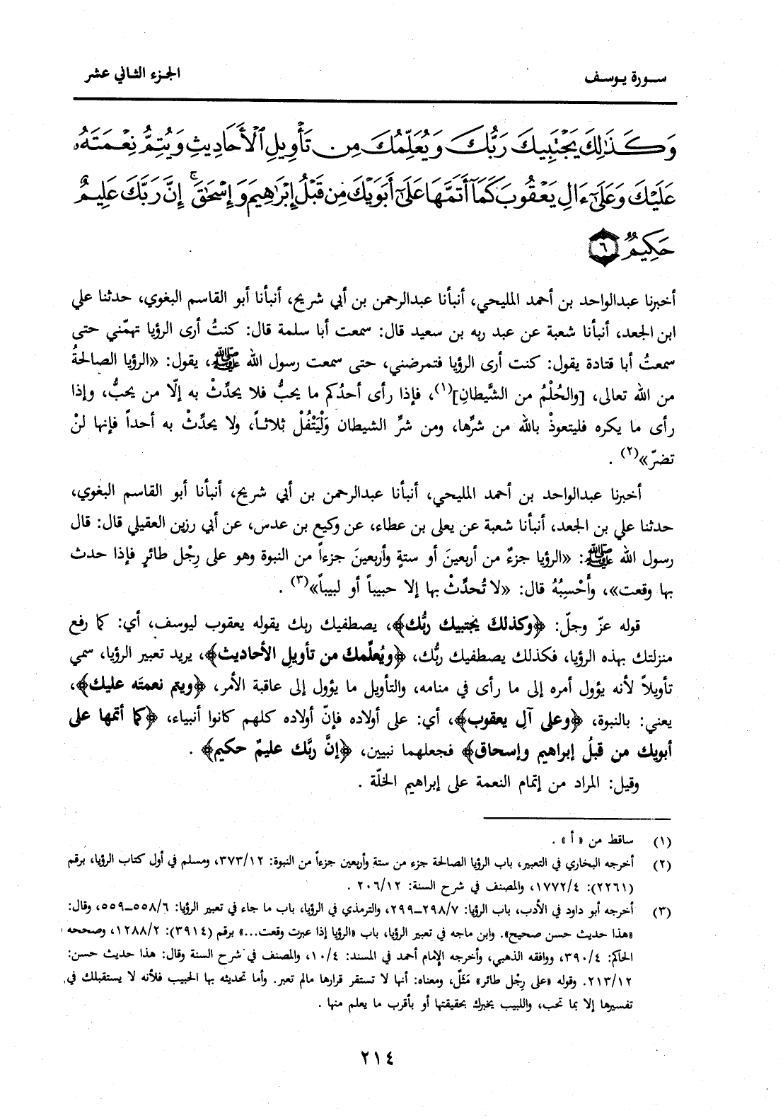 قَوْلُهُ عَزَّ وَجَلَّ: {وَكَذَلِكَ يَجْتَبِيكَ رَبُّكَ} يَصْطَفِيكَ رَبُّكَ يَقُولُهُ يَعْقُوبُ لِيُوسُفَ، أَيْ: كَمَا رَفَعَ مَنْزِلَتَكَ بِهَذِهِ الرُّؤْيَا، فَكَذَلِكَ يَصْطَفِيكَ رَبُّكَ، {وَيُعَلِّمُكَ مِنْ تَأْوِيلِ الْأَحَادِيثِ} يُرِيدُ تَعْبِيرَ الرُّؤْيَا، سُمِّيَ تأويلا لأنه يؤول أَمْرُهُ إِلَى مَا رَأَى فِي مَنَامِهِ، والتأويل ما يؤول إِلَى عَاقِبَةِ الْأَمْرِ، {وَيُتِمُّ نِعْمَتَهُ عَلَيْكَ} يَعْنِي: بِالنُّبُوَّةِ، {وَعَلَى آلِ يَعْقُوبَ} أَيْ: عَلَى أَوْلَادِهِ فَإِنَّ أَوْلَادَهُ كُلَّهُمْ كَانُوا أَنْبِيَاءَ، {كَمَا أَتَمَّهَا عَلَى أَبَوَيْكَ مِنْ قَبْلُ إِبْرَاهِيمَ وَإِسْحَاقَ} فَجَعَلَهُمَا نَبِيَّيْنَ، {إِنَّ رَبَّكَ عَلِيمٌ حَكِيمٌ} .