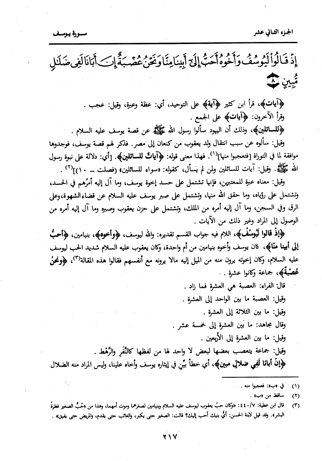 {إِذْ قَالُوا لَيُوسُفُ وَأَخُوهُ أَحَبُّ إِلَى أَبِينَا مِنَّا وَنَحْنُ عُصْبَةٌ إِنَّ أَبَانَا لَفِي ضَلَالٍ مُبِينٍ (8) } .