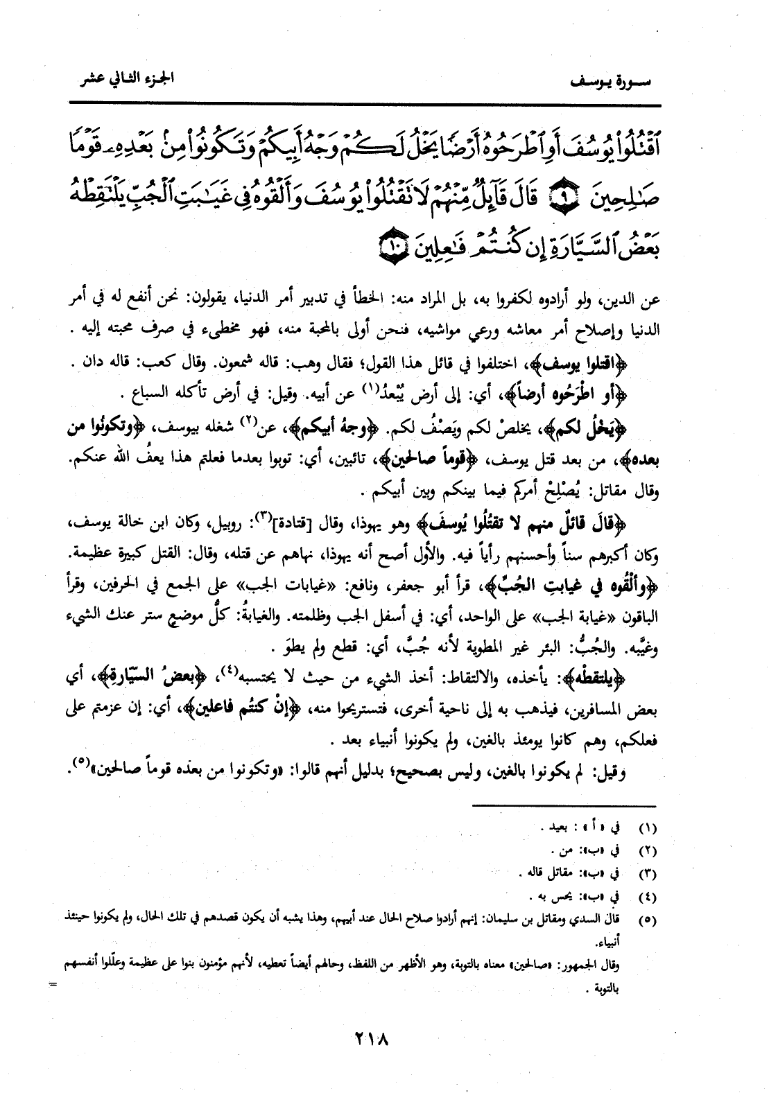 {اقْتُلُوا يُوسُفَ أَوِ اطْرَحُوهُ أَرْضًا يَخْلُ لَكُمْ وَجْهُ أَبِيكُمْ وَتَكُونُوا مِنْ بَعْدِهِ قَوْمًا صَالِحِينَ (9) قَالَ قَائِلٌ مِنْهُمْ لَا تَقْتُلُوا يُوسُفَ وَأَلْقُوهُ فِي غَيَابَةِ الْجُبِّ يَلْتَقِطْهُ بَعْضُ السَّيَّارَةِ إِنْ كُنْتُمْ فَاعِلِينَ (10) } .