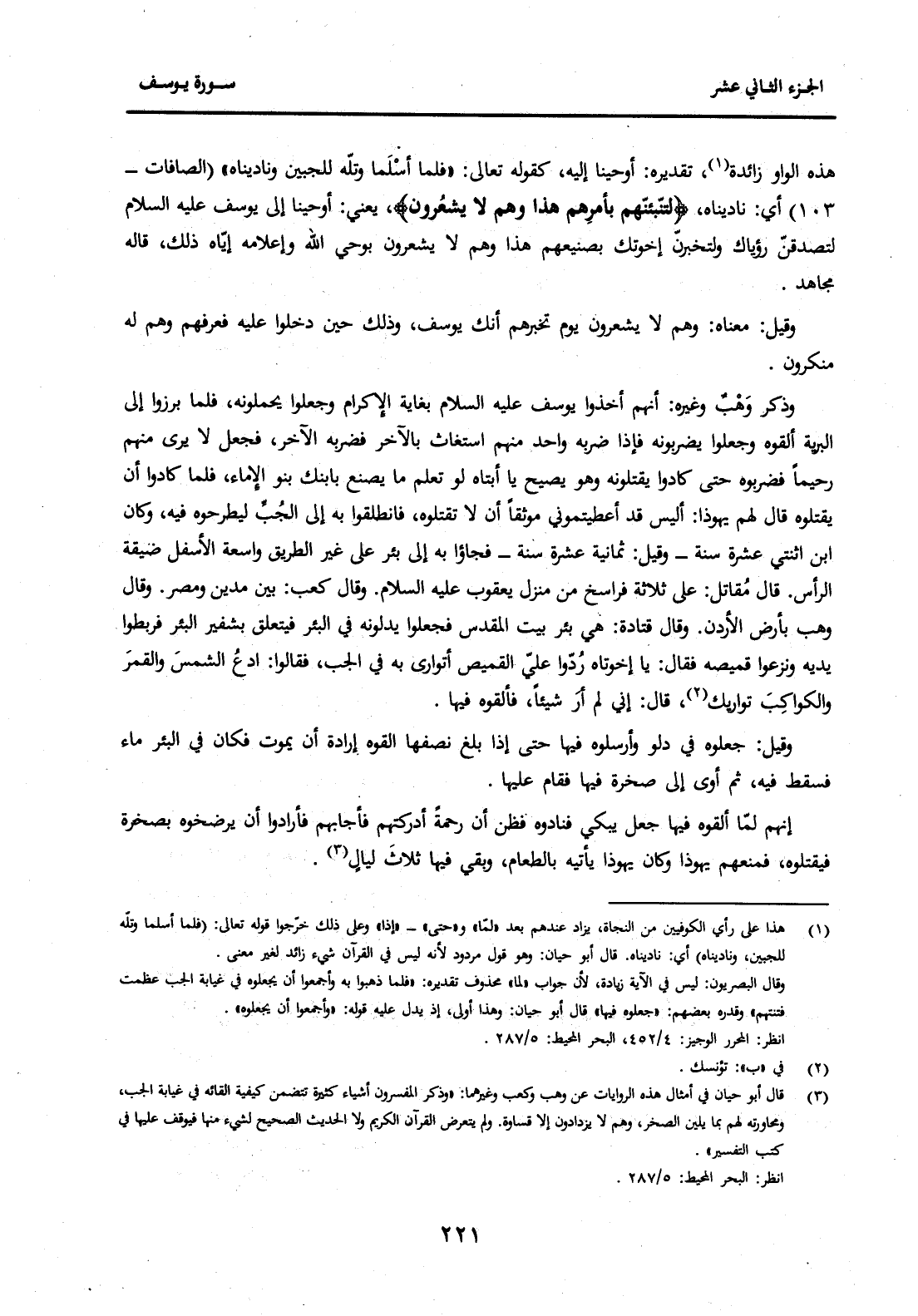 (3) قال أبو حيان في أمثال هذه الروايات عن وهب وكعب وغيرهما: "وذكر المفسرون أشياء كثيرة تتضمن كيفية إلقائه في غيابة الجب، ومحاورته لهم بما يلين الصخر، وهم لا يزدادون إلا قساوة. ولم يتعرض القرآن الكريم ولا الحديث الصحيح لشيء منها فيوقف عليها في كتب التفسير". انظر: البحر المحيط: 5 / 287.