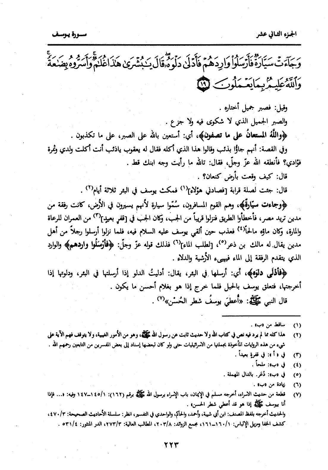 {وَجَاءَتْ سَيَّارَةٌ فَأَرْسَلُوا وَارِدَهُمْ فَأَدْلَى دَلْوَهُ قَالَ يَا بُشْرَى هَذَا غُلَامٌ وَأَسَرُّوهُ بِضَاعَةً وَاللَّهُ عَلِيمٌ بِمَا يَعْمَلُونَ (19) } .