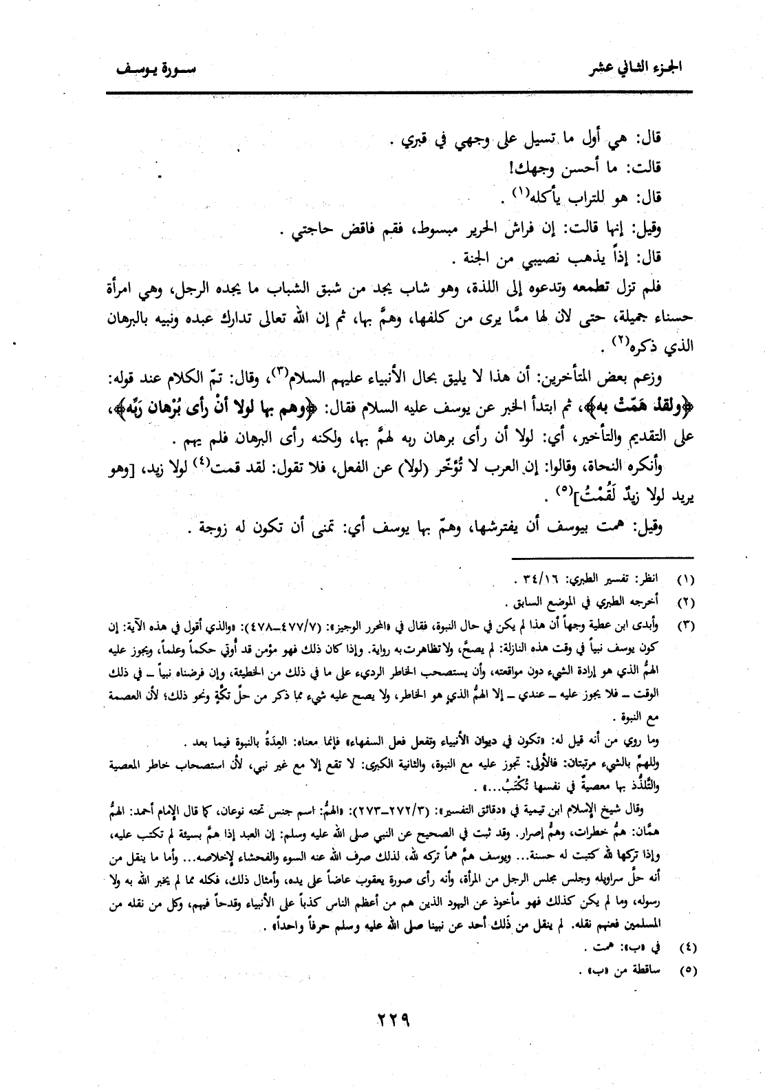(3) وأبدى ابن عطية وجها أن هذا لم يكن في حال النبوة، فقال في "المحرر الوجيز": (7 / 477-478) : "والذي أقول في هذه الآية: إن كون يوسف نبيا في وقت هذه النازلة: لم يصح، ولا تظاهرت به رواية. وإذا كان ذلك فهو مؤمن قد أوتي حكما وعلما، ويجوز عليه الهم الذي هو إرادة الشيء دون مواقعته، وأن يستصحب الخاطر الرديء على ما في ذلك من الخطيئة، وإن فرضناه نبيا -في ذلك الوقت- فلا يجوز عليه -عندي- إلا الهم الذي هو الخاطر، ولا يصح عليه شيء مما ذكر من حل تَكَّةٍ ونحو ذلك؛ لأن العصمة مع النبوة. وما روي من أنه قيل له: "تكون في ديوان الأنبياء وتفعل فعل السفهاء" فإنما معناه: العدة بالنبوة فيما بعد. وللهم بالشيء مرتبتان: فالأولى: تجوز عليه مع النبوة، والثانية الكبرى: لا تقع إلا مع غير نبي، لأن استصحاب خاطر المعصية والتلذذ بها معصية في نفسها تكتب ... ". وقال شيخ الإسلام ابن تيمية في "دقائق التفسير": (3 / 272-273) : "الهم: اسم جنس تحته نوعان، كما قال الإمام أحمد: الهم همان: هم خطرات، وهم إصرار. وقد ثبت في الصحيح عن النبي صَلَّى اللَّهُ عَلَيْهِ وَسَلَّمَ: إن العبد إذا هم بسيئة لم تكتب عليه، وإذا تركها لله كتبت له حسنة ... ويوسف هم هما تركه لله، لذلك صرف الله عنه السوء والفحشاء لإخلاصه ... وأما ما ينقل من أنه حل سراويله وجلس مجلس الرجل من المرأة، وأنه رأى صورة يعقوب عاضا على يده، وأمثال ذلك، فكله مما لم يخبر الله به ولا رسوله، وما لم يكن كذلك فهو مأخوذ عن اليهود الذين هم من أعظم الناس كذبا على الأنبياء وقدحا فيهم، وكل من نقله من المسلمين فعنهم نقله. لم ينقل من ذلك أحد عن نبينا صَلَّى اللَّهُ عَلَيْهِ وَسَلَّمَ حرفا واحدا".