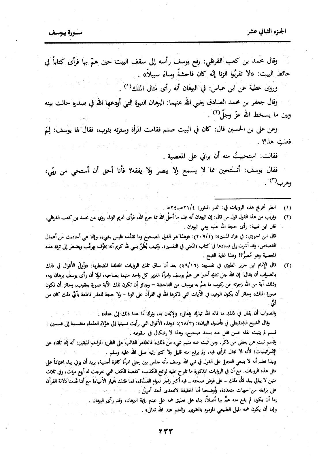 (3) قال الإمام ابن جرير الطبري في تفسيره: (16 / 49) بعد أن ساق تلك الروايات المختلفة المضطربة: "وأولى الأقوال في ذلك بالصواب أن يقال: إن الله جل ثناؤه أخبر عن همِّ يوسف وامرأة العزيز كل واحد منهما بصاحبه، لولا أن رأى يوسف برهان ربه، وذلك آية من آيات الله زجرته عن ركوب ما همَّ به يوسف من الفاحشة = وجائز أن تكون تلك الآية صورة يعقوب، وجائز أن تكون صورة الملك، وجائز أن يكون الوعيد في الآيات التي ذكرها الله في القرآن على الزنى = ولا حجة للعذر قاطعة بأيّ ذلك كان من أيّ. والصواب أن يقال في ذلك ما قاله الله تبارك وتعالى، والإيمان به، وترك ما عدا ذلك إلى عالمه". وقال الشيخ الشنقيطي في "أضواء البيان": (3 / 68) : "وهذه الأقوال التي رأيت نسبتها إلى هؤلاء العلماء منقسمة إلى قسمين: قسم لم يثبت نقله عمن نقل عنه بسند صحيح، وهذا لا إشكال في سقوطه. وقسم ثبت عن بعض من ذكر. ومن ثبت عنه منهم شيء من ذلك، فالظاهر الغالب على الظن، المزاحم لليقين: أنه إنما تلقاه عن الإسرائيليات؛ لأنه لا مجال للرأي فيه، ولم يرفع منه قليل ولا كثير إليه صَلَّى اللَّهُ عَلَيْهِ وَسَلَّمَ. وبهذا تعلم أنه لا ينبغي التجرؤ على القول في نبي الله يوسف بأنه جلس بين رجلي امرأة كافرة أجنبية، يريد أن يزني بها، اعتمادا على مثل هذه الروايات مع أن في الروايات المذكورة ما تلوح عليه لوائح الكذب، كقصة الكف التي خرجت له أربع مرات، وفي ثلاث منهن لا يبالي بها، لأن ذلك -على فرض صحته- فيه أكبر زاجر لعوام الفساق، فما ظنك بخيار الأنبياء! مع أننا قدمنا دلالة القرآن على براءته من جهات متعددة، وأوضحنا أن الحقيقة لا تتعدى أحد أمرين: إما أن يكون لم يقع منه هم بها أصلا، بناء على تعليق همه على عدم رؤية البرهان، وقد رأى البرهان. وإما أن يكون همه الميل الطبيعي المزموم بالتقوى. والعلم عند الله تعالى".