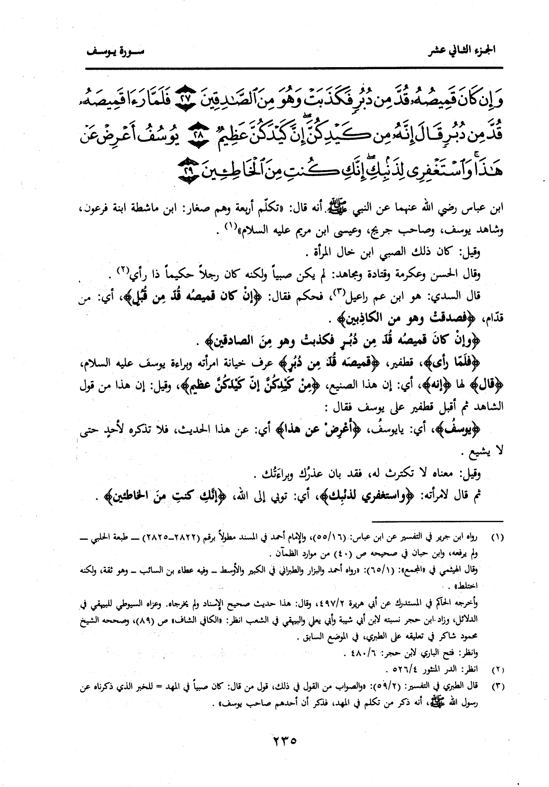 (3) قال الطبري في التفسير: (2 / 59) : "والصواب من القول في ذلك، قول من قال: كان صبيا في المهد للخبر الذي ذكرناه عن رسول الله صَلَّى اللَّهُ عَلَيْهِ وَسَلَّمَ، أنه ذكر من تكلم في المهد، فذكر أن أحدهم صاحب يوسف".