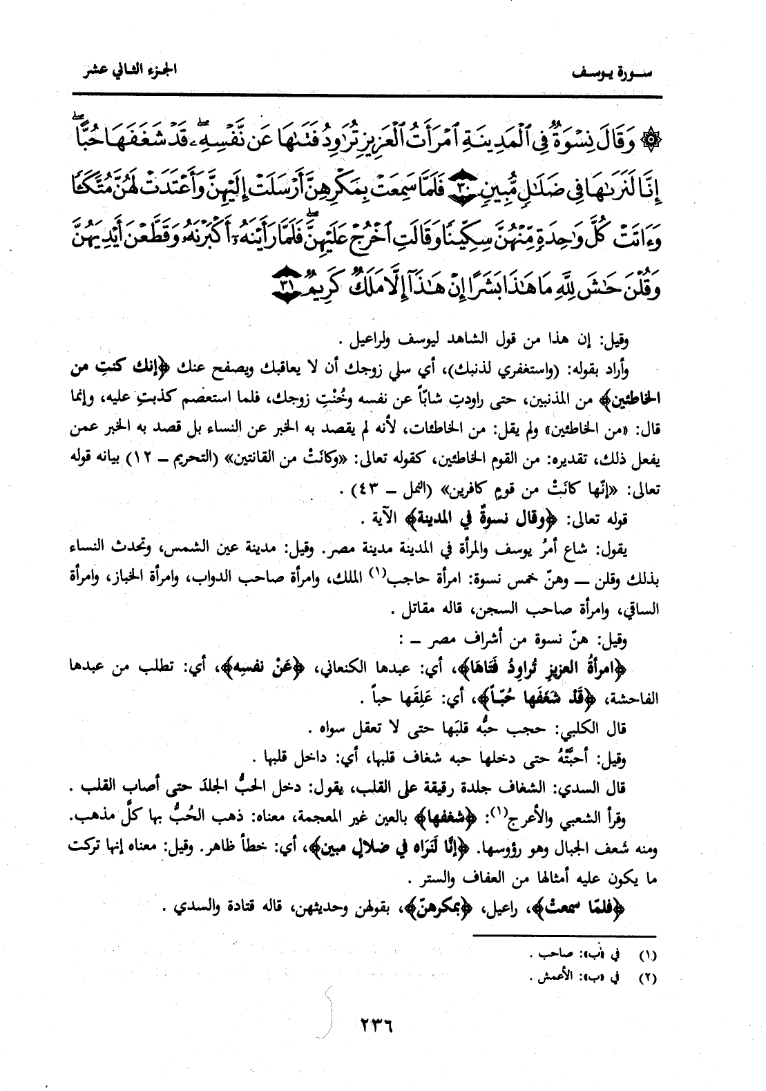 {وَقَالَ نِسْوَةٌ فِي الْمَدِينَةِ امْرَأَةُ الْعَزِيزِ تُرَاوِدُ فَتَاهَا عَنْ نَفْسِهِ قَدْ شَغَفَهَا حُبًّا إِنَّا لَنَرَاهَا فِي ضَلَالٍ مُبِينٍ (30) } .
