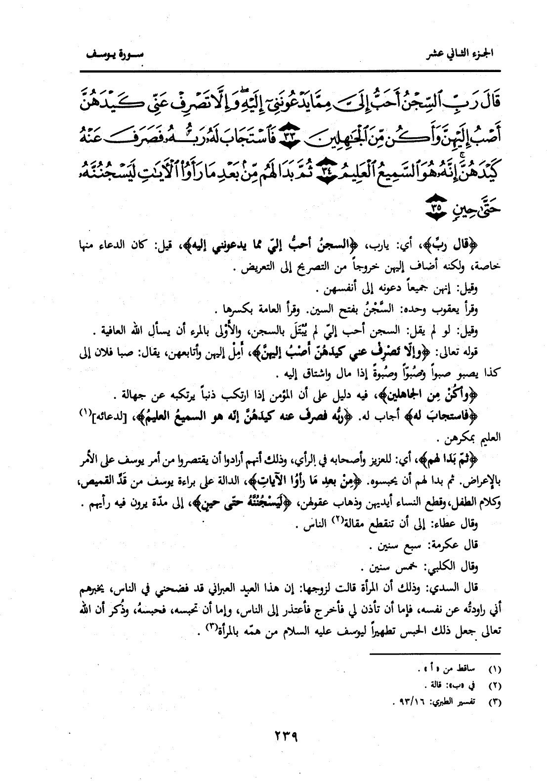 {قَالَ رَبِّ السِّجْنُ أَحَبُّ إِلَيَّ مِمَّا يَدْعُونَنِي إِلَيْهِ وَإِلَّا تَصْرِفْ عَنِّي كَيْدَهُنَّ أَصْبُ إِلَيْهِنَّ وَأَكُنْ مِنَ الْجَاهِلِينَ (33) فَاسْتَجَابَ لَهُ رَبُّهُ فَصَرَفَ عَنْهُ كَيْدَهُنَّ إِنَّهُ هُوَ السَّمِيعُ الْعَلِيمُ (34) ثُمَّ بَدَا لَهُمْ مِنْ بَعْدِ مَا رَأَوُا الْآيَاتِ لَيَسْجُنُنَّهُ حَتَّى حِينٍ (35) } .