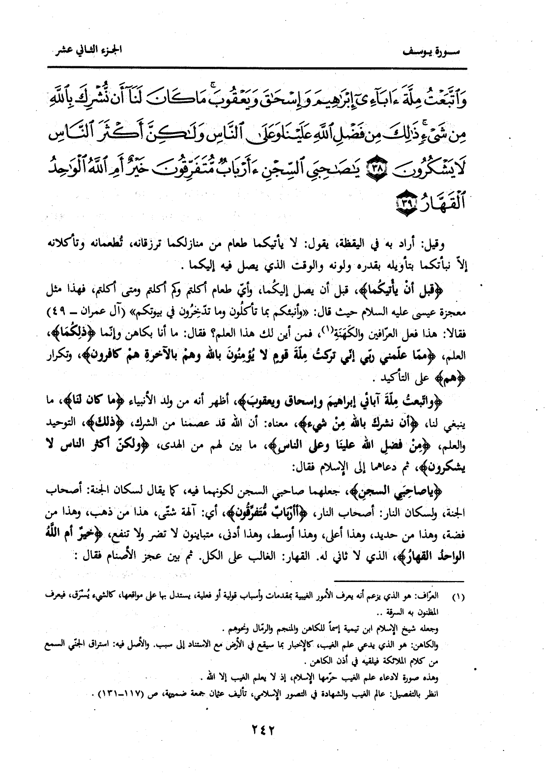 {وَاتَّبَعْتُ مِلَّةَ آبَائِي إِبْرَاهِيمَ وَإِسْحَاقَ وَيَعْقُوبَ مَا كَانَ لَنَا أَنْ نُشْرِكَ بِاللَّهِ مِنْ شَيْءٍ ذَلِكَ مِنْ فَضْلِ اللَّهِ عَلَيْنَا وَعَلَى النَّاسِ وَلَكِنَّ أَكْثَرَ النَّاسِ لَا يَشْكُرُونَ (38) يَا صَاحِبَيِ السِّجْنِ أَأَرْبَابٌ مُتَفَرِّقُونَ خَيْرٌ أَمِ اللَّهُ الْوَاحِدُ الْقَهَّارُ (39) } .
