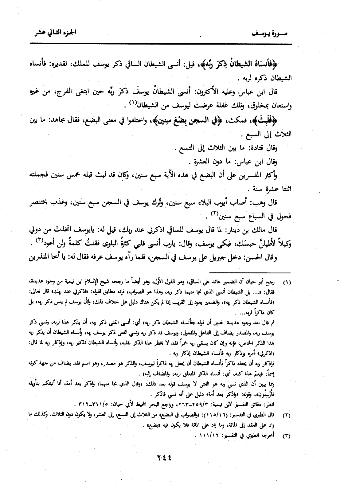 (1) رجح أبو حيان أن الضمير عائد على الساقي، وهو القول الأول، وهو أيضا ما رجحه شيخ الإسلام ابن تيمية من وجوه عديدة، فقال: " ... بل الشيطان أنسى الذي نجا منهما ذكر ربه، وهذا هو الصواب، فإنه مطابق لقوله: "اذكرني عند ربك" قال تعالى: "فأنساه الشيطان ذكر ربه"، والضمير يعود إلى القريب إذا لم يكن هناك دليل على خلاف ذلك، ولأن يوسف لم ينس ذكر ربه، بل كان ذاكرًا لربه ... ثم قال بعد وجوه عديدة: فتبين أن قوله "فأنساه الشيطان ذكر ربه" أي: أنسى الفتى ذكر ربه، أن يذكر هذا لربه، ونسي ذكر يوسف ربه، والمصدر يضاف إلى الفاعل والمفعول، ويوسف قد ذكر ربه ونسي الفتى ذكر يوسف ربه، وأنساه الشيطان أن يذكر ربه هذا الذكر الخاص، فإنه وإن كان يسقي ربه خمرا فقد لا يخطر هذا الذكر بقلبه، وأنساه الشيطان تذكير ربه، وإذكار ربه لما قال: "اذكرني" أمره بإذكار ربه فأنساه الشيطان إذكار ربه. فإذكار ربه أن يجعله ذاكرا فأنساه الشيطان أن يجعل ربه ذاكرا ليوسف، والذكر هو مصدر، وهو اسم فقد يضاف من جهة كونه اسما، فيعم هذا كله، أي: أنساه الذكر المتعلق بربه، والمضاف إليه". ومما يبين أن الذي نسي ربه هو الفتى لا يوسف قوله بعد ذلك: "وقال الذي نجا منهما، وادكر بعد أمة، أنا أنبئكم بتأويله فأرسلون"، وقوله: "وادكر بعد أمة" دليل على أنه نسي فادكر. انظر: دقائق التفسير لابن تيمية: 3 / 259-263، وراجع البحر المحيط لأبي حيان: 5 / 311-312.