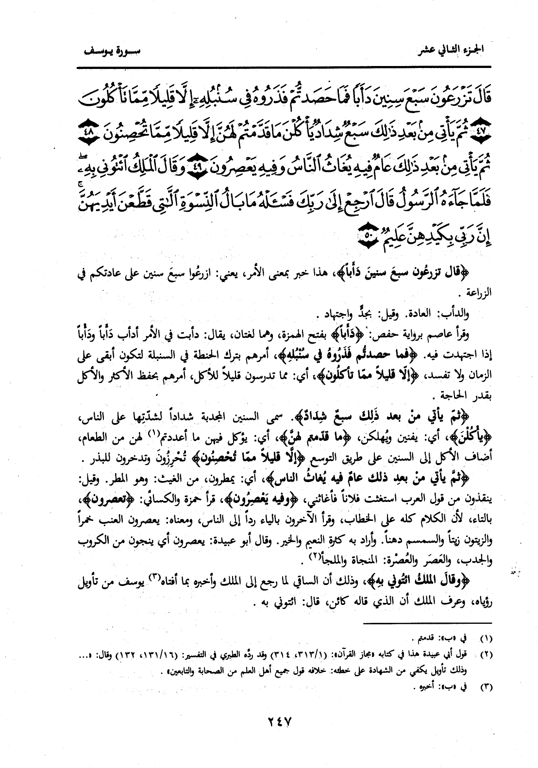وَقَرَأَ عَاصِمٌ بِرِوَايَةِ حَفْصٍ: {دَأَبًا} بِفَتْحِ الْهَمْزَةِ، وَهُمَا لُغَتَانِ، يُقَالُ: دَأَبْتُ فِي الْأَمْرِ أَدْأَبُ دَأَبَا وَدَأْبًا إِذَا اجْتَهَدْتُ فِيهِ. {فَمَا حَصَدْتُمْ فَذَرُوهُ فِي سُنْبُلِهِ} أَمْرَهُمْ بِتَرْكِ الْحِنْطَةِ فِي السُّنْبُلَةِ لِتَكُونَ أَبْقَى عَلَى الزَّمَانِ وَلَا تَفْسُدَ، {إِلَّا قَلِيلًا مِمَّا تَأْكُلُونَ} أَيْ: مِمَّا تَدْرُسُونَ قَلِيلًا لِلْأَكْلِ، أَمَرَهُمْ بِحِفْظِ الْأَكْثَرِ وَالْأَكْلِ بِقَدْرِ الْحَاجَةِ.
