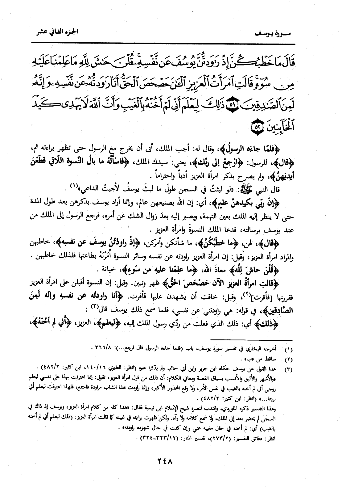 (3) هذا القول عن يوسف حكاه ابن جرير وابن أبي حاتم، ولم يذكرا غيره (انظر: الطبري 16 / 140، ابن كثير: 2 / 482) . "والأشهر والأليق والأنسب بسياق القصة ومعاني الكلام: أن ذلك من قول امرأة العزيز، تقول: إنما اعترفت بهذا على نفسي ليعلم زوجي أني لم أخنه بالغيب في نفس الأمر، ولا وقع المحذور الأكبر، وإنما راودت هذا الشاب مراودة فامتنع، فلهذا اعترفت ليعلم أني بريئة ... " (انظر: ابن كثير: 2 / 482) . وهذا التفسير ذكره الماوردي، وانتدب لنصره شيخ الإسلام ابن تيمية فقال: "هذا كله من كلام امرأة العزيز، ويوسف إذ ذاك في السجن لم يحضر بعد إلى الملك، ولا سمع كلامه ولا رآه. ولكن ظهرت براءته في غيبته كما قالت امرأة العزيز: (ذلك ليعلم أني لم أخنه بالغيب) أي: لم أخنه في حال مغيبه عني وإن كنت في حال شهوده راودته". انظر: دقائق التفسير: (2 / 273) ، تفسير المنار: (12 / 323-324) .