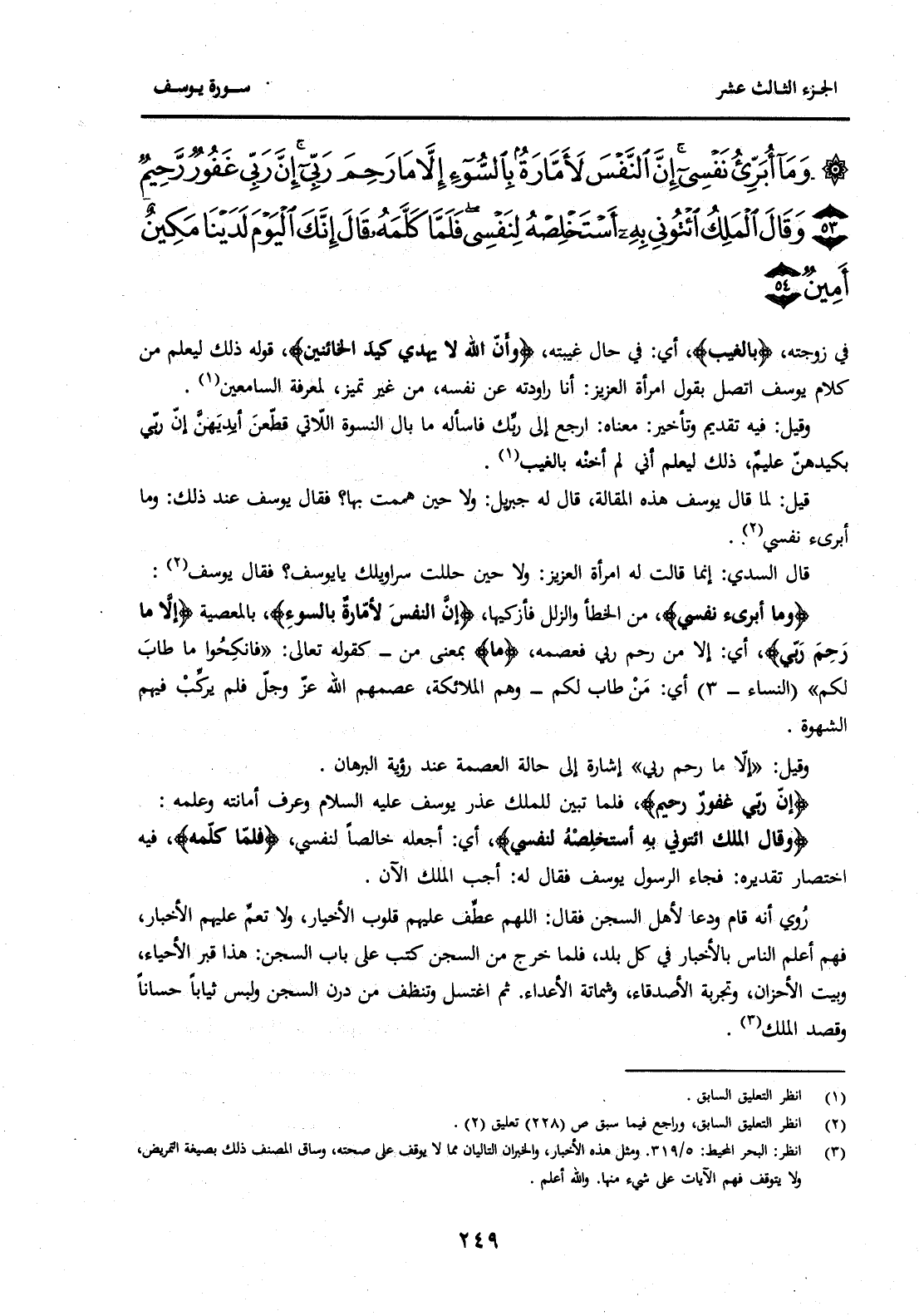 {وَمَا أُبَرِّئُ نَفْسِي} مِنَ الْخَطَإِ وَالزَّلَلِ فَأُزَكِّيهَا، {إِنَّ النَّفْسَ لَأَمَّارَةٌ بِالسُّوءِ} بِالْمَعْصِيَةِ {إِلَّا مَا رَحِمَ رَبِّي} أَيْ: إِلَّا مَنْ رَحِمَ رَبِّي فَعَصَمَهُ، " مَا " بِمَعْنَى مِنْ -كَقَوْلِهِ تَعَالَى: {فَانْكِحُوا مَا طَابَ لَكُمْ} (النِّسَاءِ -3) أَيْ: مَنْ طَابَ لَكُمْ-وَهُمُ الْمَلَائِكَةُ، عَصَمَهُمُ اللَّهُ عَزَّ وَجَلَّ فَلَمْ يُرَكِّبْ فِيهِمُ الشَّهْوَةَ.