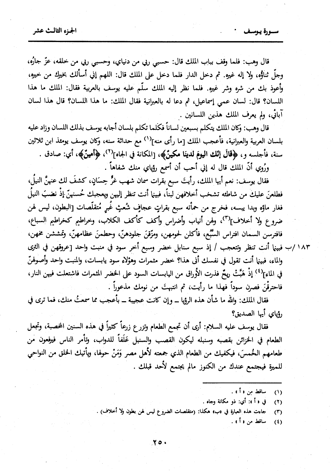 فَقَالَ يُوسُفُ: نَعَمْ أَيُّهَا الْمَلِكُ، رَأَيْتَ سَبْعَ بَقَرَاتٍ سِمَانٍ شُهْبٍ غُرٍّ حِسَانٍ، كَشَفَ لَكَ عَنْهُنَّ النِّيلُ، فَطَلَعْنَ عَلَيْكَ مِنْ شَاطِئِهِ تَشْخَبُ أَخَلَافُهُنَّ لَبَنًا، فَبَيْنَمَا أَنْتَ تَنْظُرُ إِلَيْهِنَّ وَيُعْجِبُكَ حُسْنُهُنَّ إِذْ نَضَبَ النِّيلُ فَغَارَ مَاؤُهُ وَبَدَا يُبْسُهُ، فَخَرَجَ مِنْ حِمْأَتِهِ سَبْعُ بَقَرَاتٍ عِجَافٌ شُعْثٌ غُبْرٌ مُتَقَلِّصَاتُ [الْبُطُونِ، لَيْسَ لَهُنَّ ضُرُوعٌ وَلَا أَخْلَافٌ] (3) ، وَلَهُنَّ أَنْيَابٌ وَأَضْرَاسٌ وَأَكُفٌّ كَأَكُفِّ الْكِلَابِ، وَخَرَاطِيمُ كَخَرَاطِيمَ السِّبَاعِ، فَافْتَرَسْنَ السِّمَانَ افْتِرَاسَ السَّبُعِ، فَأَكَلْنَ لُحُومَهُنَّ، وَمَزَّقْنَ جُلُودَهُنَّ، وَحَطَّمْنَ عِظَامَهُنَّ، وَتَمْشَشْنَ مُخَّهُنَّ، فَبَيْنَمَا أَنْتَ تنظر وتتعجب 183/ب إِذْ سَبْعُ سَنَابِلَ خُضَرٍ وَسَبْعٌ أُخَرَ سُودٍ فِي مَنْبَتٍ وَاحِدٍ [عُرُوقُهُنَّ فِي الثَّرَى وَالْمَاءِ، فَبَيْنَمَا أَنْتَ تَقُولُ فِي نَفْسِكَ أَنَّى هَذَا؟ خُضَرٌ مُثْمِرَاتٌ وَهَؤُلَاءِ سُودٌ يَابِسَاتٌ، وَالْمَنْبَتُ وَاحِدٌ وَأُصُولُهُنَّ فِي الْمَاءِ] (4) إِذْ هَبَّتْ رِيحٌ فَذَرَتِ الْأَوْرَاقَ مِنَ الْيَابِسَاتِ السُّودِ عَلَى الْخُضْرِ الْمُثْمِرَاتِ فَاشْتَعَلَتْ فِيهِنَّ النَّارُ، فَاحْتَرَقْنَ فَصِرْنَ سُودًا فَهَذَا مَا رَأَيْتَ، ثُمَّ انْتَبَهْتَ مِنْ نَوْمِكَ مَذْعُورًا.