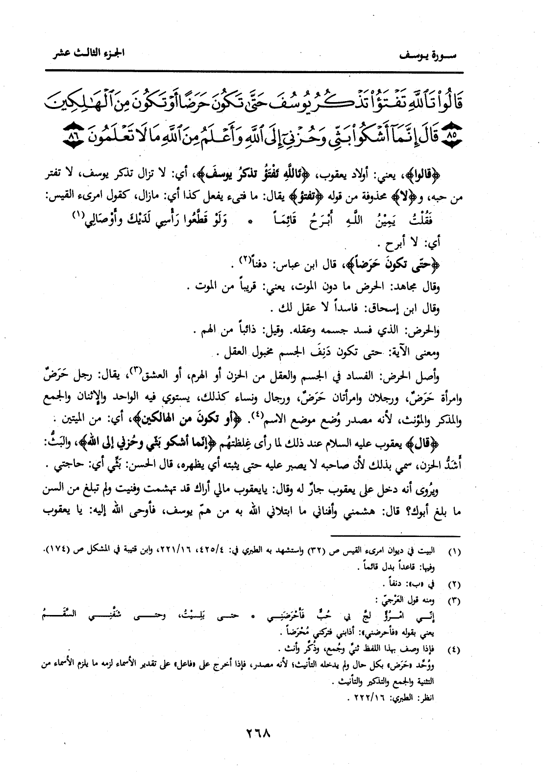 {قَالُوا تَاللَّهَ تَفْتَأُ تَذْكُرُ يُوسُفَ حَتَّى تَكُونَ حَرَضًا أَوْ تَكُونَ مِنَ الْهَالِكِينَ (85) قَالَ إِنَّمَا أَشْكُو بَثِّي وَحُزْنِي إِلَى اللَّهِ وَأَعْلَمُ مِنَ اللَّهِ مَا لَا تَعْلَمُونَ (86) } .