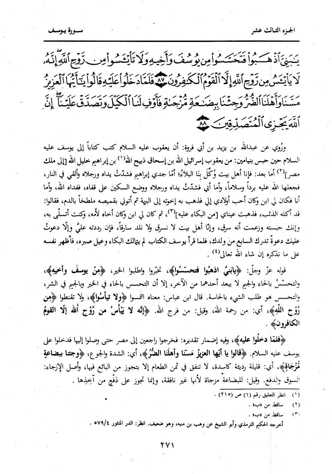 {يَا بَنِيَّ اذْهَبُوا فَتَحَسَّسُوا مِنْ يُوسُفَ وَأَخِيهِ وَلَا تَيْأَسُوا مِنْ رَوْحِ اللَّهِ إِنَّهُ لَا يَيْئَسُ مِنْ رَوْحِ اللَّهِ إِلَّا الْقَوْمُ الْكَافِرُونَ (87) فَلَمَّا دَخَلُوا عَلَيْهِ قَالُوا يَا أَيُّهَا الْعَزِيزُ مَسَّنَا وَأَهْلَنَا الضُّرُّ وَجِئْنَا بِبِضَاعَةٍ مُزْجَاةٍ فَأَوْفِ لَنَا الْكَيْلَ وَتَصَدَّقْ عَلَيْنَا إِنَّ اللَّهَ يَجْزِي الْمُتَصَدِّقِينَ (88) } .