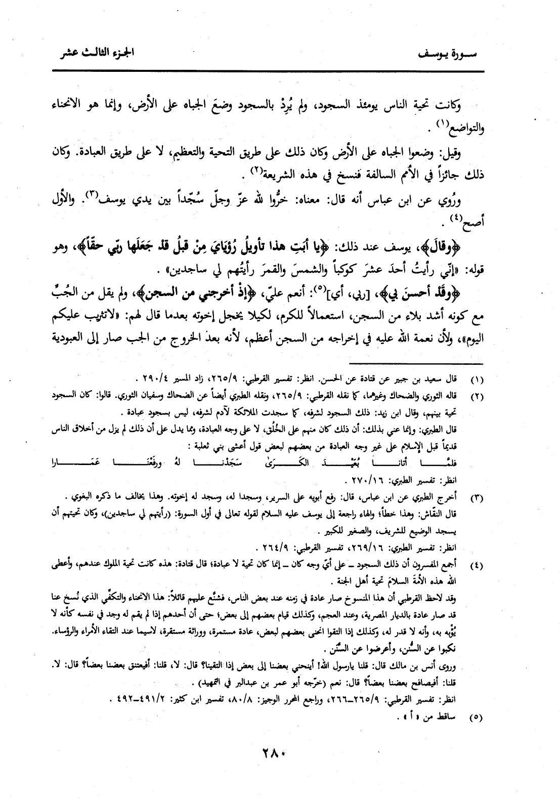 (4) أجمع المفسرون أن ذلك السجود -على أي وجه كان- إنما كان تحية لا عبادة؛ قال قتادة: هذه كانت تحية الملوك عندهم، وأعطى الله هذه الأمة السلام تحية أهل الجنة. وقد لاحظ القرطبي أن هذا المنسوخ صار عادة في زمنه عند بعض الناس، فشنَّع عليهم قائلا: هذا الانحناء والتكفي الذي نُسخ عنا قد صار عادة بالديار المصرية، وعند العجم، وكذلك قيام بعضهم إلى بعض؛ حتى إن أحدهم إذا لم يقم له وجد في نفسه كأنه لا يُؤْبه به، وأنه لا قدر له، وكذلك إذا التقوا انحنى بعضهم لبعض، عادة مستمرة، ووراثة مستقرة، لا سيما عند التقاء الأمراء والرؤساء. نكبوا عن السُّنن، وأعرضوا عن السُّنن. وروى أنس بن مالك قال: قلنا يا رسول الله! أينحني بعضنا إلى بعض إذا التقينا؟ قال: لا، قلنا، أفيعتنق بعضنا بعضا؟ قال: لا. قلنا: أفيصافح بعضنا بعضا؟ قال: نعم (خرّجه أبو عمر بن عبد البر في التمهيد) . انظر: تفسير القرطبي: 9 / 265-266، وراجع المحرر الوجيز: 8 / 80، تفسير ابن كثير: 2 / 491-492.