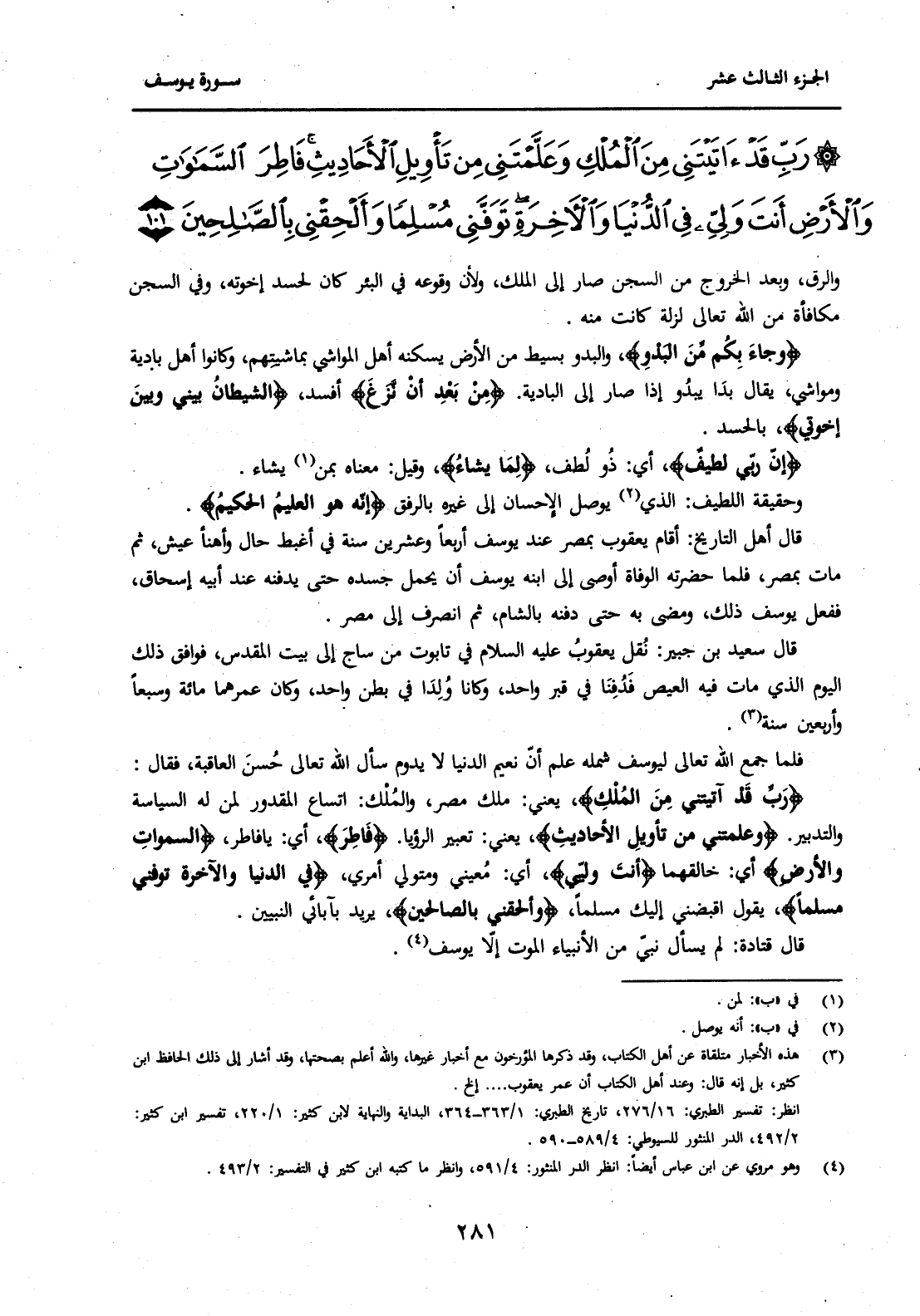 {رَبِّ قَدْ آتَيْتَنِي مِنَ الْمُلْكِ} يَعْنِي: مُلْكَ مِصْرَ، وَالْمُلْكُ: اتِّسَاعُ الْمَقْدُورِ لِمَنْ لَهُ السِّيَاسَةُ وَالتَّدْبِيرُ. {وَعَلَّمْتَنِي مِنْ تَأْوِيلِ الْأَحَادِيثِ} يَعْنِي: تَعْبِيرَ الرُّؤْيَا. {فَاطِرَ} أَيْ: يا فاطر، {السَّمَوَاتِ وَالْأَرْضِ} أَيْ: خَالِقَهُمَا {أَنْتَ وَلِيِّي} أَيْ: مُعِينِي وَمُتَوَلِّي أَمْرِي، {فِي الدُّنْيَا وَالْآخِرَةِ تَوَفَّنِي مُسْلِمًا} يَقُولُ اقْبِضْنِي إِلَيْكَ مُسْلِمًا، {وَأَلْحِقْنِي بِالصَّالِحِينَ} يُرِيدُ بِآبَائِي النَّبِيِّينَ.