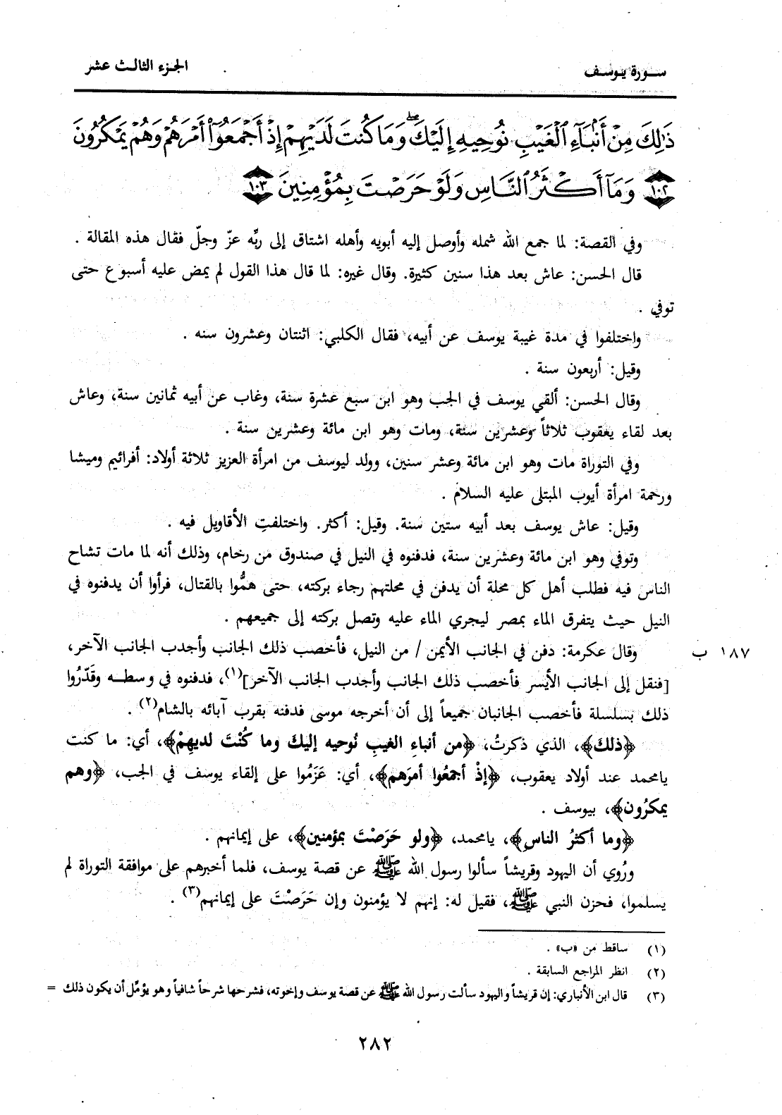(3) قال ابن الأنباري: إن قريشا واليهود سألت رسول الله صَلَّى اللَّهُ عَلَيْهِ وَسَلَّمَ عن قصة يوسف وإخوته، فشرحها شرحا شافيا وهو يؤمِّل أن يكون ذلك سببا لإسلامهم، فخالفوا ظنَّه، فحزن رسول الله صَلَّى اللَّهُ عَلَيْهِ وَسَلَّمَ، فعزاه الله تعالى بهذه الآية. انظر: زاد المسير: 4 / 293، البحر المحيط: 5 / 350.