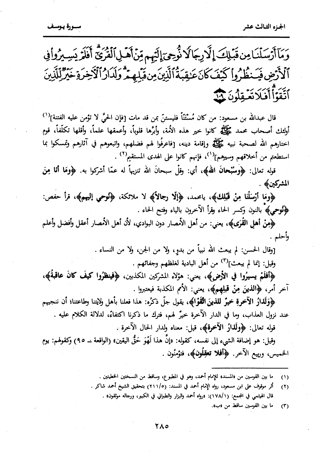 {وَمَا أَرْسَلْنَا مِنْ قَبْلِكَ إِلَّا رِجَالًا نُوحِي إِلَيْهِمْ مِنْ أَهْلِ الْقُرَى أَفَلَمْ يَسِيرُوا فِي الْأَرْضِ فَيَنْظُرُوا كَيْفَ كَانَ عَاقِبَةُ الَّذِينَ مِنْ قَبْلِهِمْ وَلَدَارُ الْآخِرَةِ خَيْرٌ لِلَّذِينَ اتَّقَوْا أَفَلَا تَعْقِلُونَ (109) } .