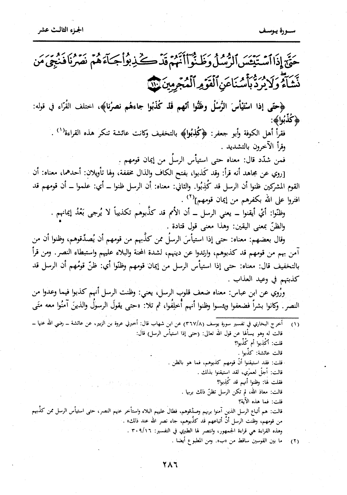(1) أخرج البخاري في تفسير سورة يوسف (8 / 367) عن ابن شهاب قال: أخبرني عروة بن الزبير، عن عائشة -رضي الله عنها- قالت له وهو يسألها عن قول الله تعالى: (حتى إذا استيئس الرسل) قال: قلت: أكذبوا أو كذبوا؟ قالت عائشة: كذبوا. قلت: فقد استيقنوا أن قومهم كذبوهم، فما هو بالظن. قالت: أجل لعمري، لقد استيقنوا بذلك. فقلت لها: وظنوا أنهم قد كذبوا؟ قالت: معاذ الله، لم تكن الرسل تظن ذلك بربها. قلت: فما هذه الآية؟ قالت: هم أتباع الرسل الذين آمنوا بربهم وصدقوهم، فطال عليهم البلاء واستأخر عنهم النصر، حتى استيئس الرسل ممن كذبهم من قومهم، وظنت الرسل أن أتباعهم قد كذبوهم، جاء نصر الله عند ذلك". وهذه القراءة هي قراءة الجمهور، وانتصر لها الطبري في التفسير: 16 / 309.