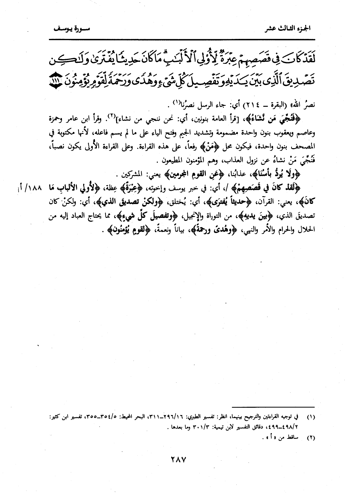 {لَقَدْ كَانَ فِي قَصَصِهِمْ} 188/أأَيْ: فِي خَبَرِ يُوسُفَ وَإِخْوَتِهِ {عِبْرَةٌ} عِظَةٌ {لِأُولِي الْأَلْبَابِ مَا كَانَ} يَعْنِي: الْقُرْآنَ {حَدِيثًا يُفْتَرَى} أَيْ: يُخْتَلَقُ {وَلَكِنْ تَصْدِيقَ الَّذِي} أَيْ: وَلَكِنْ كَانَ تَصْدِيقَ الَّذِي {بَيْنَ يَدَيْهِ} مِنَ التَّوْرَاةِ وَالْإِنْجِيلِ {وَتَفْصِيلَ كُلِّ شَيْءٍ} مِمَّا يَحْتَاجُ الْعِبَادُ إِلَيْهِ مِنَ الْحَلَالِ وَالْحَرَامِ وَالْأَمْرِ وَالنَّهْيِ {وَهُدًى وَرَحْمَةً} بَيَانًا وَنِعْمَةً {لِقَوْمٍ يُؤْمِنُونَ} .
