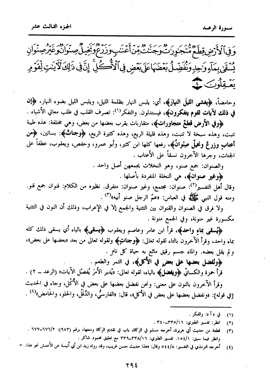 {وَفِي الْأَرْضِ قِطَعٌ مُتَجَاوِرَاتٌ وَجَنَّاتٌ مِنْ أَعْنَابٍ وَزَرْعٌ وَنَخِيلٌ صِنْوَانٌ وَغَيْرُ صِنْوَانٍ يُسْقَى بِمَاءٍ وَاحِدٍ وَنُفَضِّلُ بَعْضَهَا عَلَى بَعْضٍ فِي الْأُكُلِ إِنَّ فِي ذَلِكَ لَآيَاتٍ لِقَوْمٍ يَعْقِلُونَ (4) } .